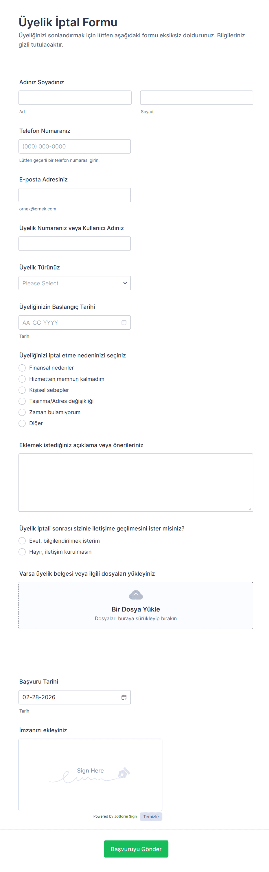 İptal formu, bir hizmetin, üyeliğin, etkinlik kaydının veya sözleşmenin feshini resmi olarak talep etmek için kullanılan bir belge veya online formdur. İptal işlemini verimli bir şekilde gerçekleştirmek için gerekli ayrıntıları toplar.
