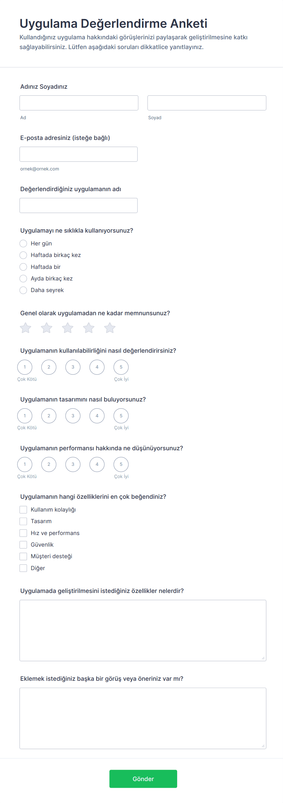 - İçerik ve alanlar kullanım durumuna göre değişir: konsept testleri beklentilere ve ilk izlenimlere odaklanırken, satın alma sonrası anketler memnuniyet ve ürün performansını vurgular.