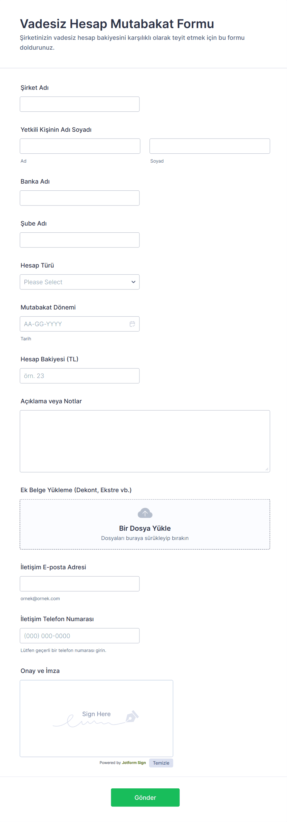 Jotform'un Muhasebeci Formları ile muhasebe firmanız için müşteri bilgilerini güvenli bir şekilde toplayın. Ayrıntıları toplamak için aşağıdan bir şablon seçin - ardından sürükle-bırak oluşturucumuzla ihtiyaçlarınıza tam olarak uyacak şekilde özelleştirin. Kod yazmadan benzersiz logonuzu yükleyebilir, yazı tiplerini ve renkleri değiştirebilir, bir e-imza alanı ekleyebilir ve verileri diğer platformlarla otomatik olarak senkronize etmek için 100'den fazla ücretsiz form entegrasyonu ile entegre edebilirsiniz. Ardından formunuzu şirketinizin web sitesine yerleştirin, sosyal medyada paylaşın veya yanıtları toplamaya başlamak için bir kopyala-yapıştır form bağlantısıyla doğrudan müşterilere e-posta ile gönderin. Dağınık kağıt formlardan güçlü online Muhasebeci Formlarına geçerek müşterilerinize daha sorunsuz bir deneyim sunarken tüm bilgileriniz için güvenli bir veri tabanı oluşturun.