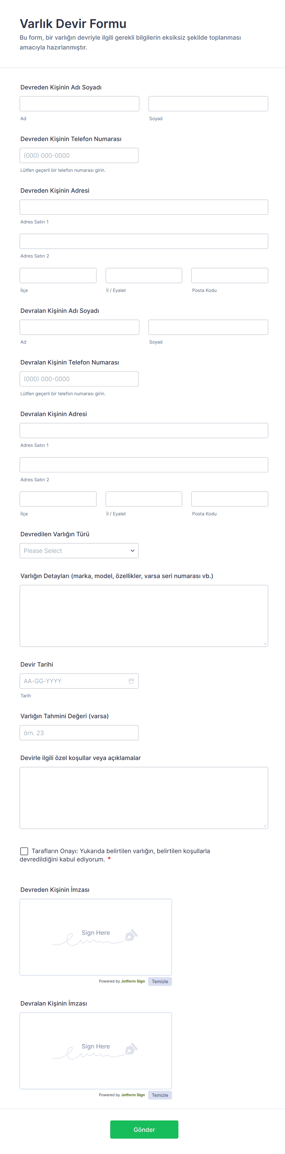 Jotform gibi platformlarla oluşturulduğunda, varlık verileri güvenli bir şekilde depolanır ve şifreleme, erişim kontrolleri ve gizlilik düzenlemelerine uyumluluk seçenekleri sunulur.