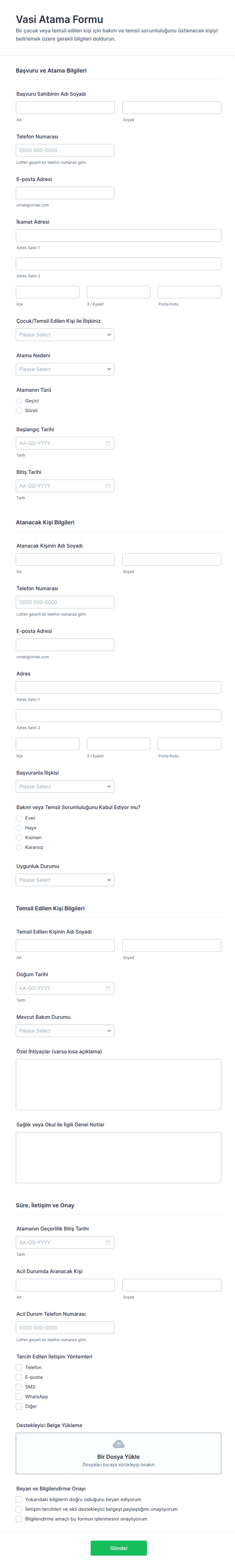Vasi Atama Formu, bakım veya temsil sorumluluğu için başvuru ve atama sürecinde veri toplama işini tek yerde düzenlemek isteyen aileler ve kurumlar için hazırlanmış bir form şablonudur.
