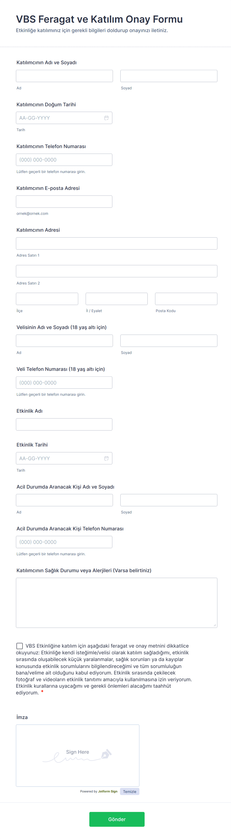Jotform ile feragat formları oluşturmak ve yönetmek sorunsuz ve verimli bir sürece dönüşür. Jotform'un kodlama gerektirmeyen, sürükle-bırak Form Oluşturucu'su kullanıcıların feragat şablonlarını hızlıca özelleştirmesine veya sıfırdan form oluşturmasına, katılımcı bilgileri, dijital imzalar ve onay kutuları gibi temel alanları eklemesine olanak tanır. Otomatik veri depolama, anlık bildirimler ve diğer araçlarla entegrasyon, imzalı feragatlerin toplanmasını ve yönetimini kolaylaştırır. İster küçük işletme sahibi, ister etkinlik organizatörü veya sağlık hizmeti sağlayıcısı olun, Jotform yasal bağlayıcılığı olan feragatleri online olarak toplamanızı sağlayarak, kağıt işlerini azaltır ve uyumluluğu kolayca sağlar.