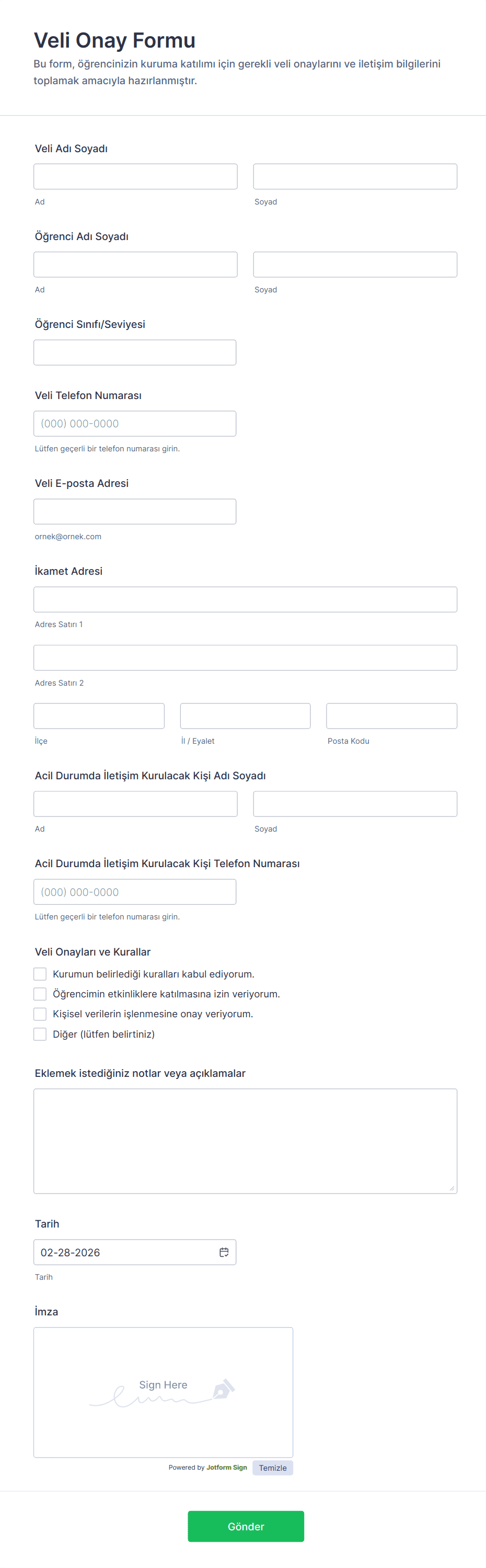 Ebeveyn onay formu, çocuklarının belirli etkinliklere katılması için ebeveynlerden izin almak üzere kullanılır. Bir yaz kampı veya okul dışı bir program düzenliyorsanız, ücretsiz Ebeveyn Onay ve İzin Formumuz, ebeveynlerden elektronik imza toplamanızı kolaylaştıracaktır. Formu ihtiyaçlarınızı karşılayacak şekilde özelleştirin ve web sitenize yerleştirin veya form yanıtlarını toplamaya başlamak üzere bağlantıyı ebeveynlerle paylaşın. Ebeveynler, bu forma çocukları ile ilgili bilgileri girebilir, hüküm ve koşullarınızı okuyabilir, çocuklarının tıbbi durumları ve alerjilerini belirtebilir, acil durum iletişim bilgilerini ekleyebilir ve ebeveyn izin formunuzu herhangi bir cihazdan imzalayabilir. Jotform hesabınıza gelen yanıtları anında alabilir ve bunları indirilebilir ve yazdırılabilir PDF'lere dönüştürebilirsiniz. Ebeveyn izin formunuzu özelleştirmek için, sürükle-bırak Form Oluşturucumuz ile yalnızca birkaç tıklama yapmanız yeterli. Kolayca form alanları ile hüküm ve koşullarınızı ekleyebilir, logonuzu yükleyebilir ve hatta yazı tipleri ile renkleri etkinliğinize uyacak şekilde değiştirebilirsiniz. Google E-Tablolar, Dropbox veya Airtable gibi diğer online uygulamaları kullanıyorsanız, form yanıtları bu hesaplara otomatik olarak göndermek üzere 100'den fazla ücretsiz entegrasyonumuzu kullanabilirsiniz. Ebeveyn izin formunuzu özelleştirmeyi tamamladıktan sonra, form yanıtlarını hemen almaya başlamak için formu online olarak yayınlamanız yeterli!
