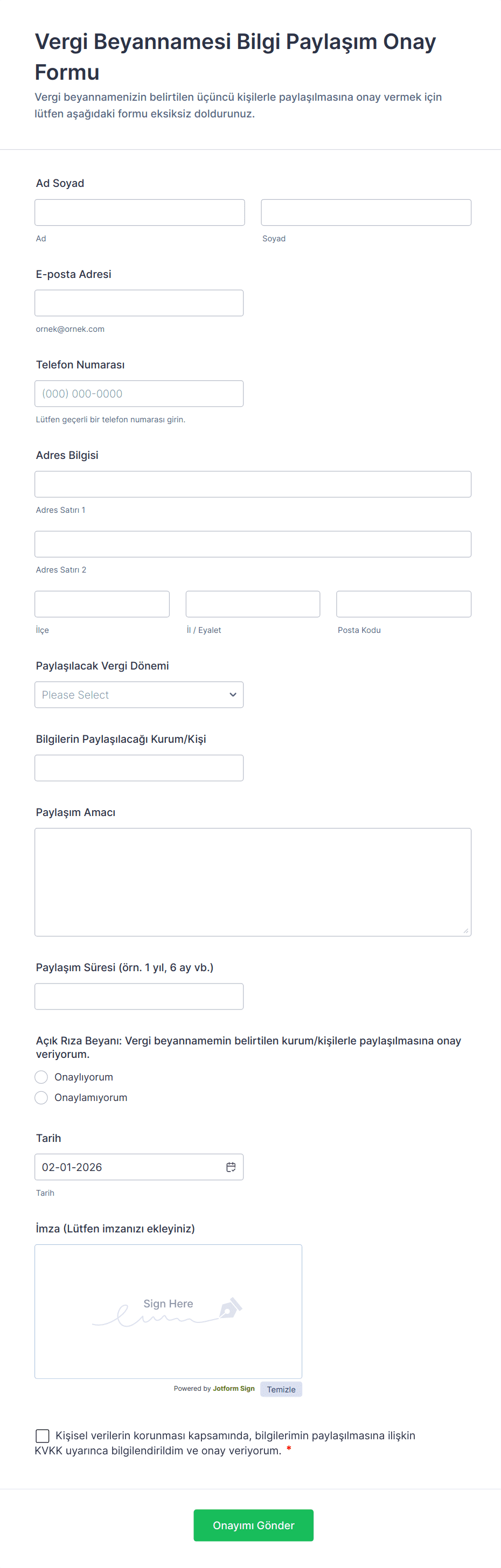 İster resmi vergi formları toplayan bir devlet kurumu, ister müşterilerinizden bilgi toplayan bir muhasebeci olun, Jotform'un Vergi Formları ile vergi bilgilerini online olarak güvenli bir şekilde alın! Aşağıdan bir form şablonu seçerek ve ihtiyaçlarınıza ve markanıza uyacak şekilde özelleştirerek işe başlayın. Ardından formu paylaşın veya herhangi bir akıllı telefon, tablet veya bilgisayarda doldurulmak üzere web sitenize ekleyin. Yanıtlar güvenli Jotform hesabınızda saklanır ve otomatik olarak profesyonel PDF belgelerine dönüştürülebilir.