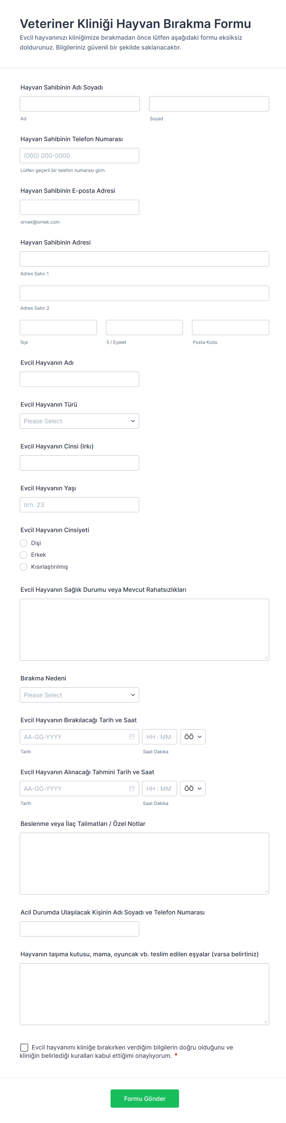 Hayvan sahibinin iletişim bilgileri, evcil hayvanın temel bilgileri, bırakma nedeni ve beslenme veya ilaç talimatları gibi kliniğin operasyonunu destekleyen bilgiler yer almalıdır.