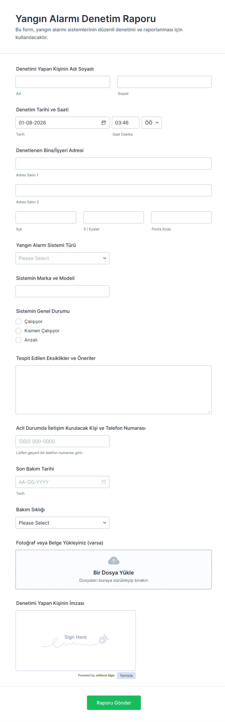 Jotform ile kullanıcılar, kendi özel ihtiyaçlarına göre uyarlanmış dijital Yangın Denetim Formları oluşturarak tüm yangın denetim sürecini kolaylaştırabilir. Jotform'un kullanımı kolay sürükle-bırak Form Oluşturucu'su sayesinde kullanıcılar hiçbir kod yazmadan ilgili alanları ekleyebilir, kontrol listelerini entegre edebilir, görüntü yükleyebilir ve hatta dijital imza toplayabilir. Otomatik veri depolama, anlık bildirimler ve diğer araçlarla sorunsuz entegrasyon, denetim kayıtlarını yönetmeyi, uyumluluk takibini ve raporları paydaşlarla paylaşmayı kolaylaştırır. İster itfaiye müfettişi, ister güvenlik görevlisi, ister mülk yöneticisi veya tesis bakım ekibi olun, Jotform kapsamlı denetimleri verimli bir şekilde gerçekleştirmenizi ve düzenli, erişilebilir kayıtlar tutmanızı sağlar.