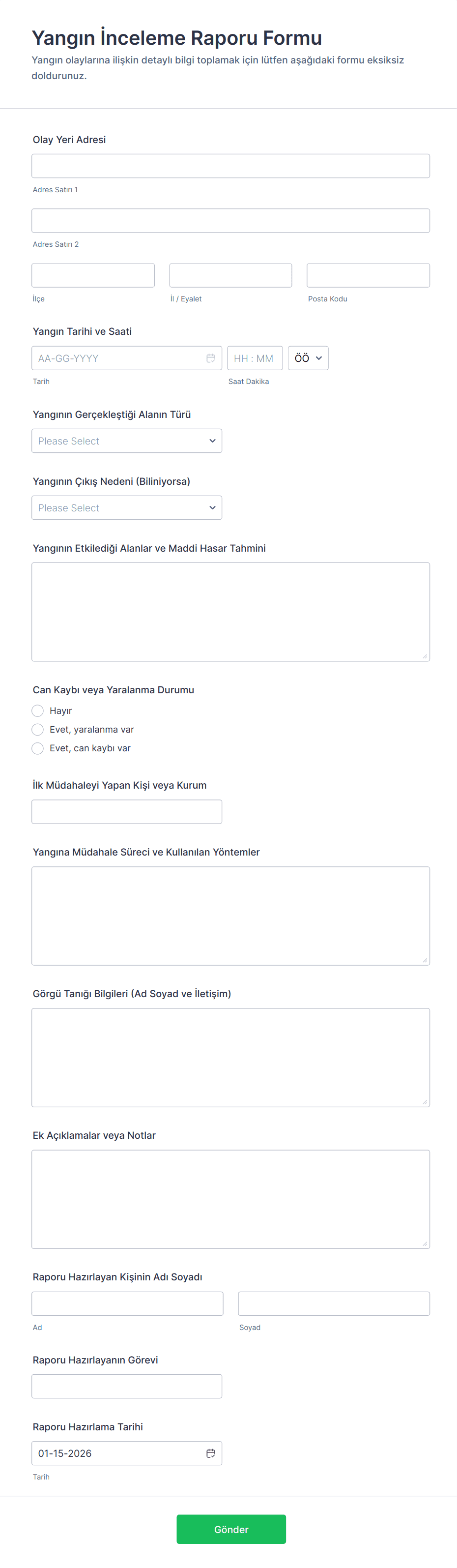 Yangın İnceleme Raporu Formu
