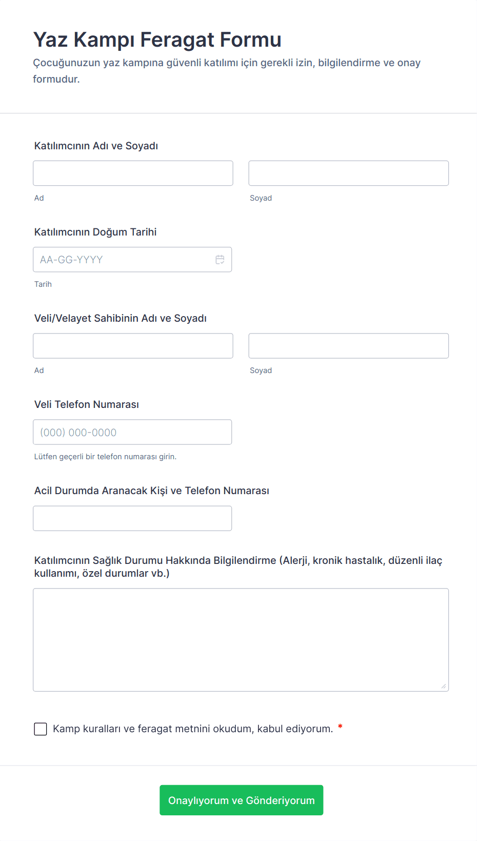 Bu adımları takip ederek, kampınızın güvenli ve verimli bir şekilde çalışmasına yardımcı olacak önemli izinlerin ve bilgilerin toplanmasını kolaylaştıran güvenli ve kullanıcı dostu bir Yaz Kampı Onam Formu oluşturabilirsiniz.