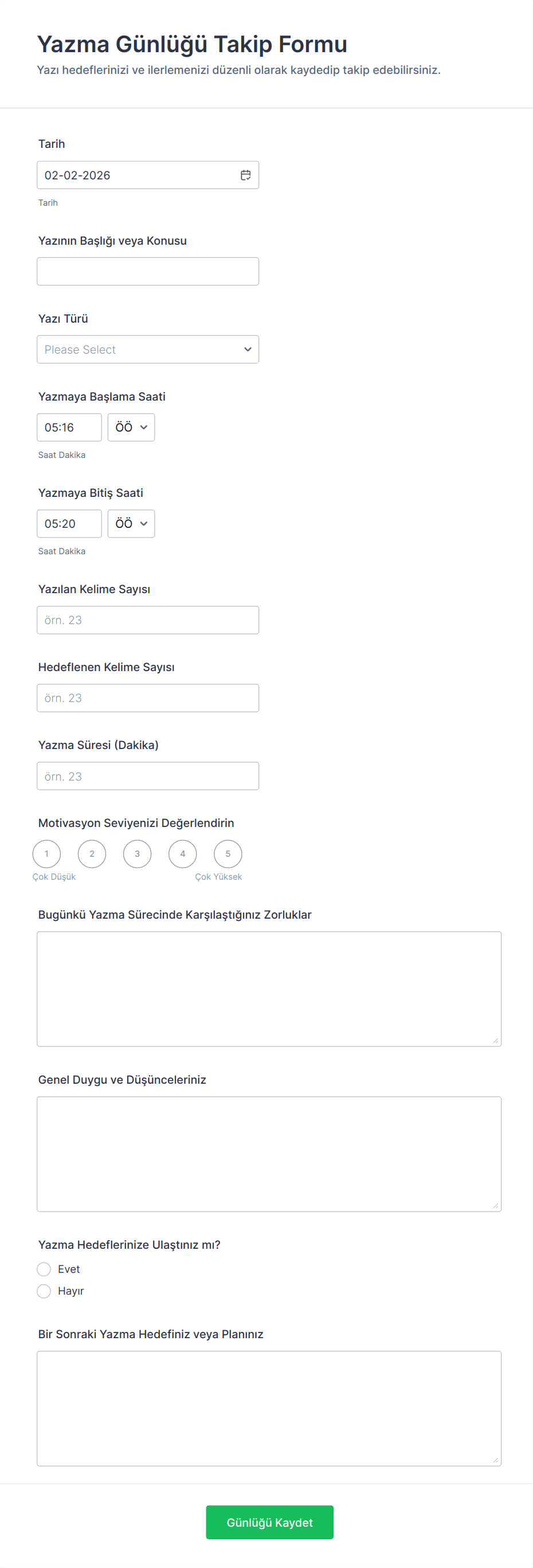 - Not veya düşünceler için metin alanları