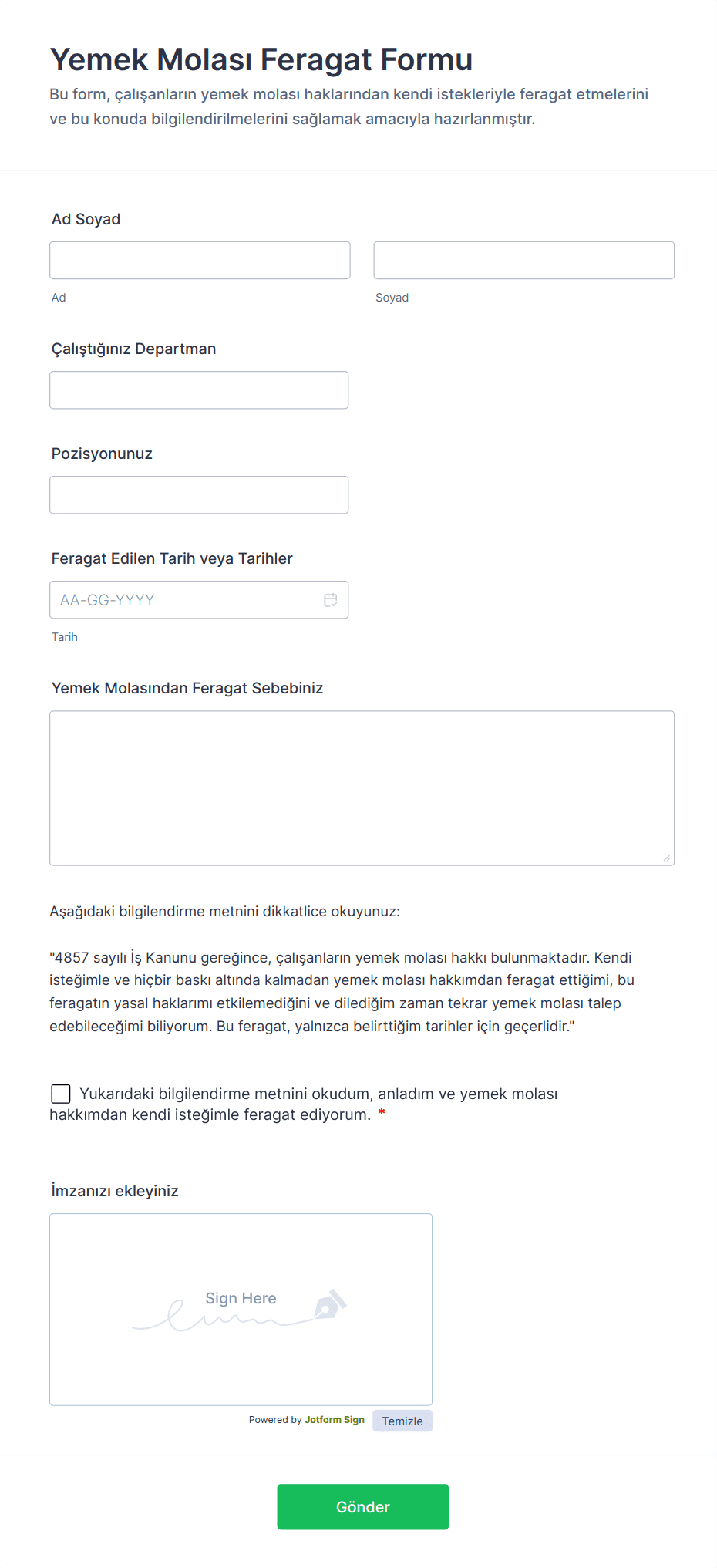 Yemek Molası Feragat Formu, çalışanların belirli tarihler için yemek molası haklarından kendi istekleriyle vazgeçme beyanlarını insan kaynakları birimlerinin dijital olarak toplamasına ve arşivlemesine yardımcı olur.