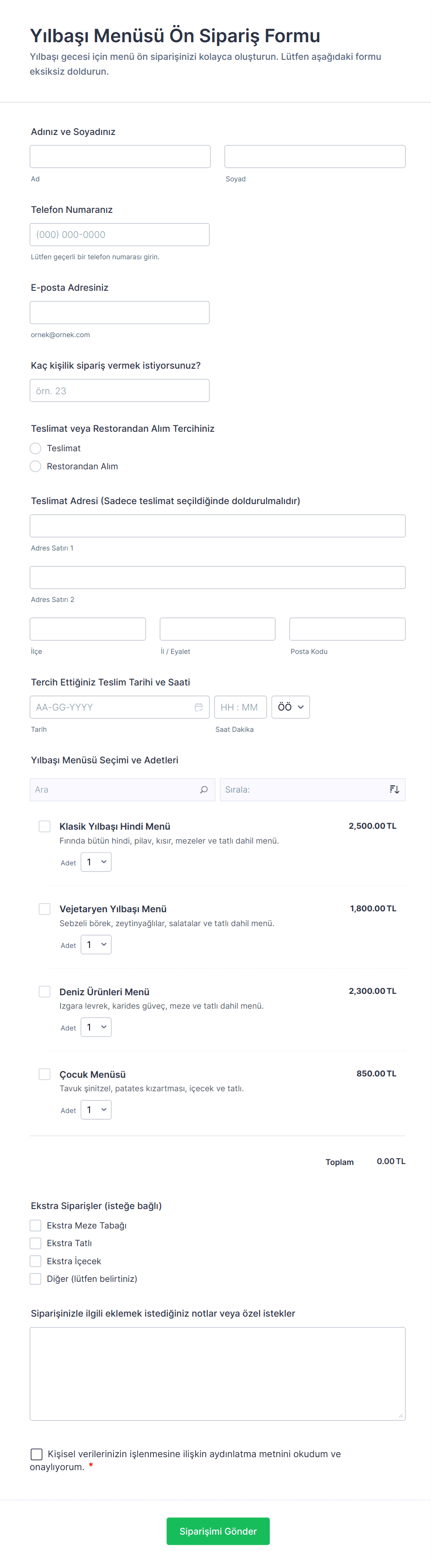 - Yemek ön siparişleri için teslim alma/teslimat seçenekleri, beslenme tercihleri ve sipariş miktarı alanları gerekebilir.