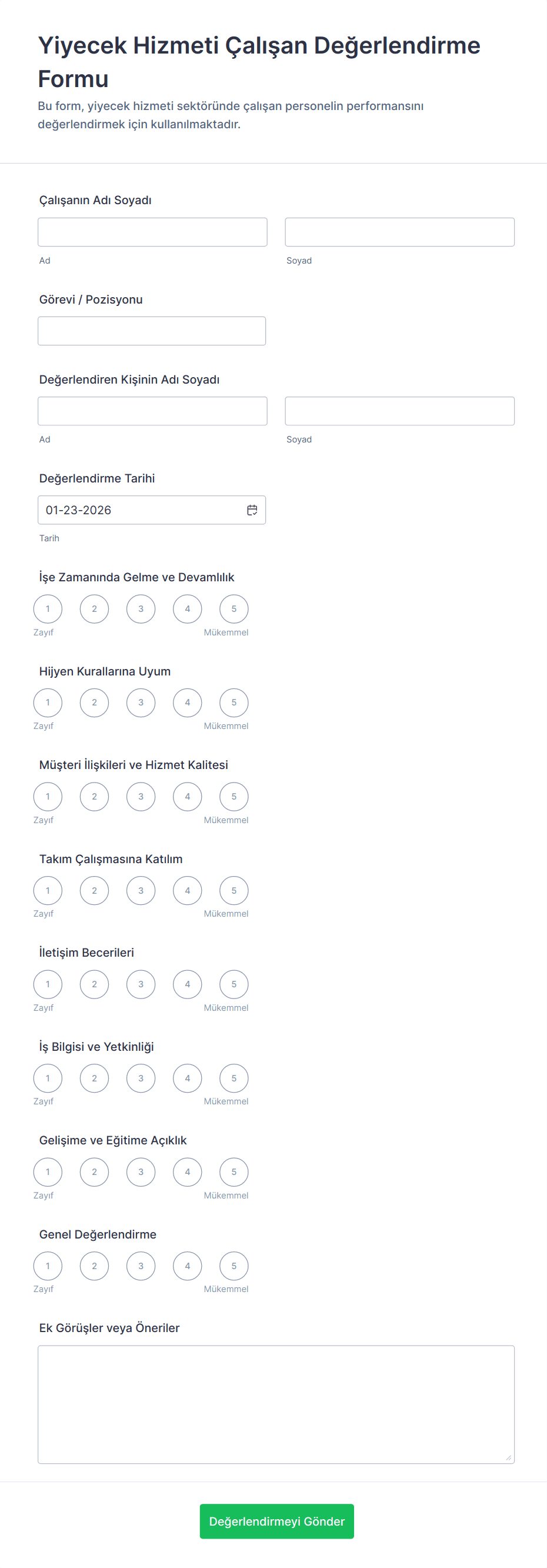 Çalışan değerlendirme formu, çalışanların becerileri, hedefleri ve başarıları hakkında bilgi toplayarak çalışanların ilerlemesini izlemek için kullanılan bir performans değerlendirme aracıdır. Ücretsiz Çalışan Değerlendirme Formu şablonlarımızla, çalışanlarınızın neleri iyi yaptığını kolayca görmek ve iyileştirme alanlarını belirlemek için yanıtları çevrim içi olarak toplayabilirsiniz. Çalışan değerlendirmelerinizi bilgisayarınızdan veya mobil cihazınızdan yaptıktan sonra, Jotform hesabınızda güvenli bir şekilde saklanacaktır - bu da değerlendirmeleri yönetmeyi ve yazdırılabilir PDF'lere dönüştürmeyi kolaylaştırır!
