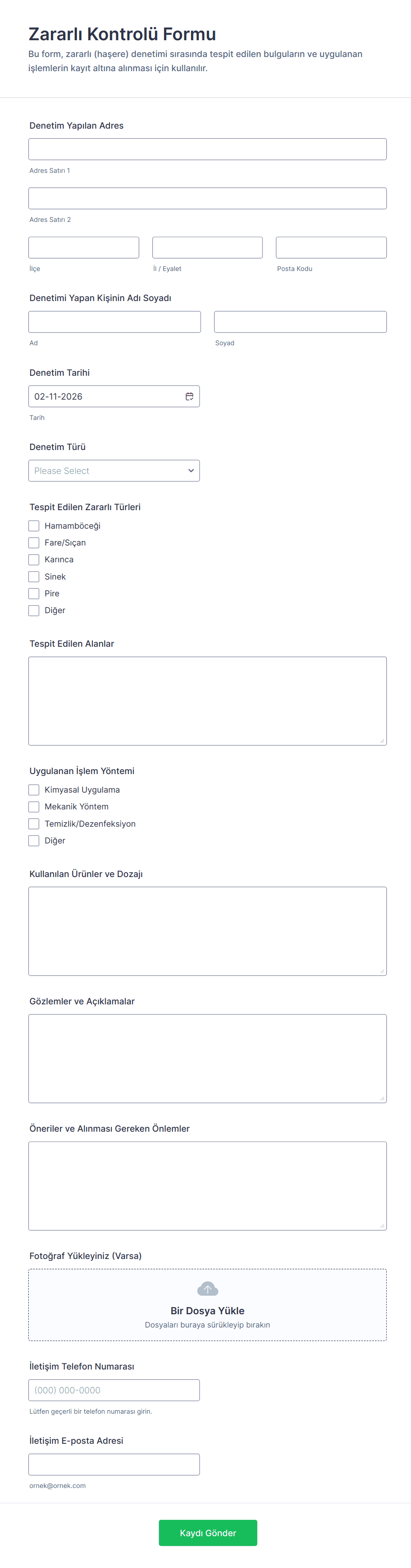 İnceleme formları; varlıkların, ortamların veya süreçlerin durumunu, uyumluluğunu veya kalitesini sistematik olarak değerlendirmek, kaydetmek ve raporlamak için kullanılan özel belgelerdir. Bu formlar inşaat, üretim, gayrimenkul, konaklama, sağlık ve ulaşım gibi çok çeşitli sektörlerde vazgeçilmezdir. Yaygın kullanım alanları arasında güvenlik denetimleri, ekipman kontrolleri, mülk incelemeleri, araç muayeneleri, gıda güvenliği denetimleri ve tesis bakım incelemeleri bulunur. Bu formlar, denetim sürecini standartlaştırarak gerekli tüm kriterlerin değerlendirilmesini, sorunların belgelenmesini ve düzeltici eylemlerin verimli bir şekilde takip edilmesini sağlar.