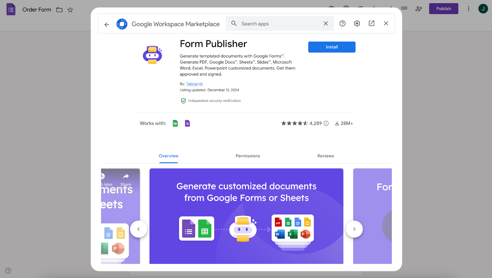 Form Yayınlayıcıyı formunuza ekleyerek gönderimlerinizden belgeler oluşturun. Bu eklentiyle, farklı dosya formatlarında belgeler oluşturabilir, kendi şablonlarınızı tasarlayabilir, onay iş akışları oluşturabilir ve e-imza taleplerinde bulunabilirsiniz. İster fatura ister sertifika oluşturmak isteyin, Form Yayınlayıcı bu işi yapabilir.
