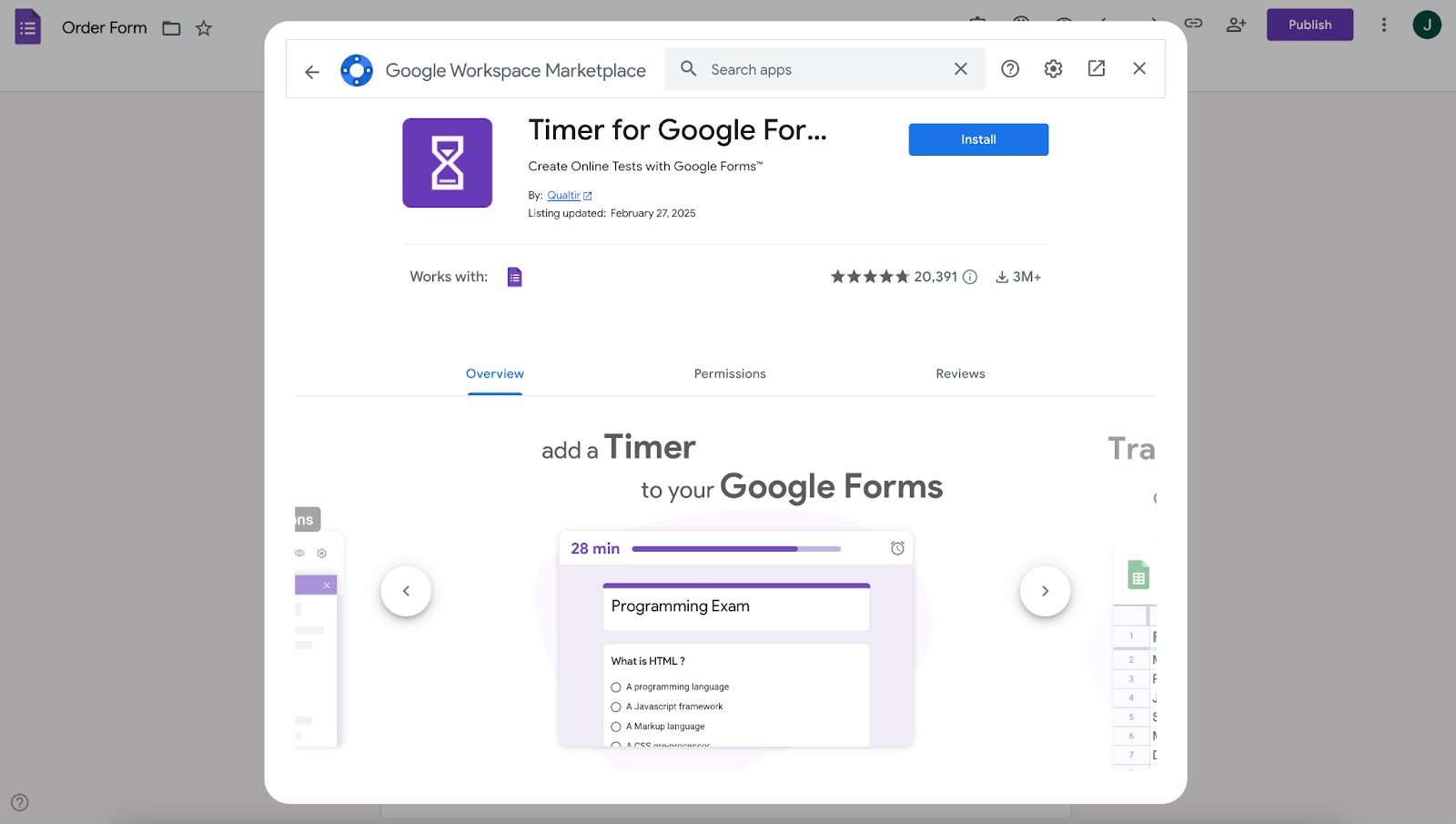 Google Form’unuzu zamanlı bir sınava dönüştürmek veya katılımcıların tamamlamasının ne kadar sürdüğünü izlemek istiyorsanız, Google Forms İçin Timer kullanışlı bir eklentidir. Google Forms düzenleyicisine doğrudan entegre olur — harici araçlar veya hesaplara gerek yoktur.