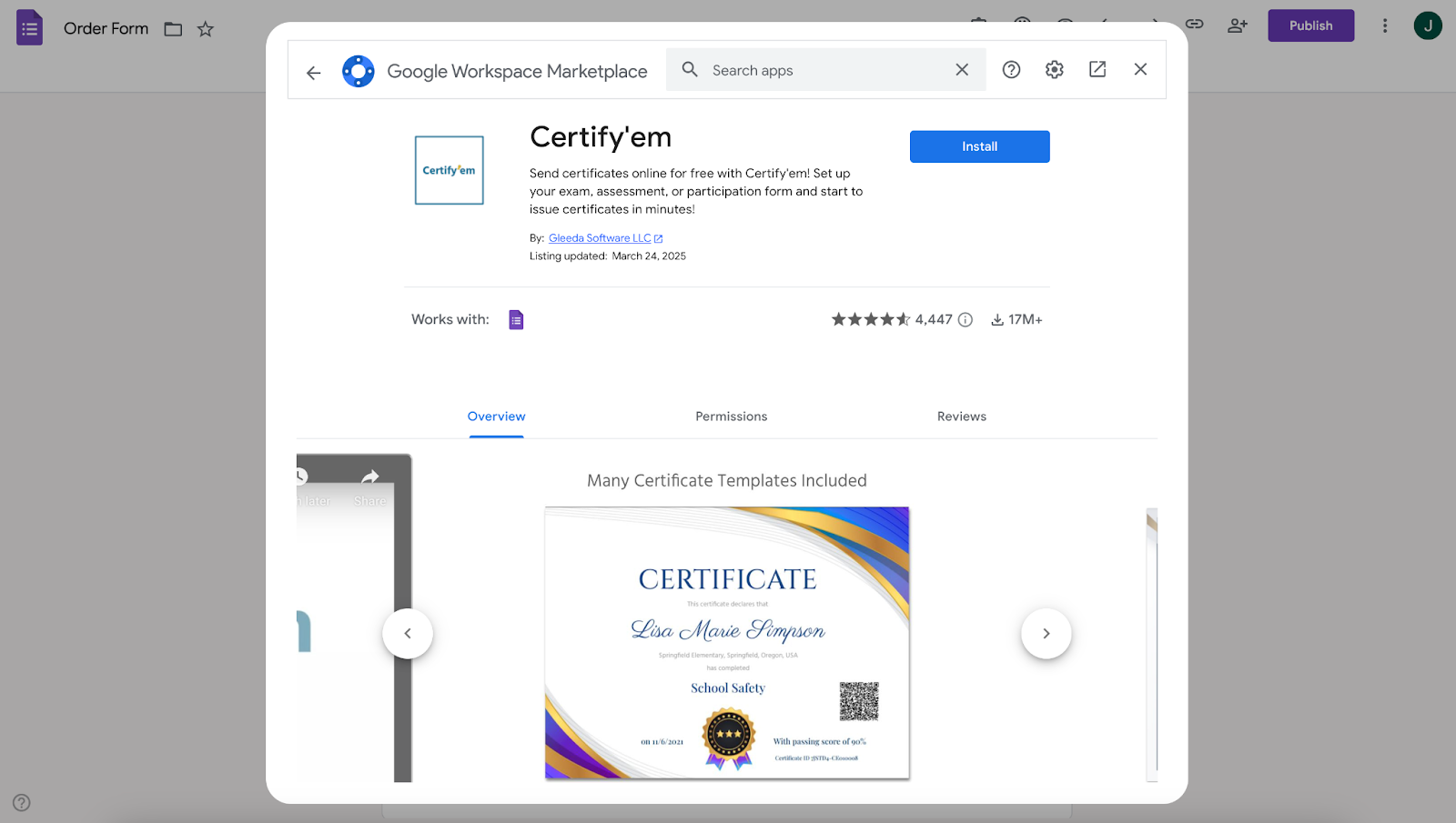 Certify’em, öğrencilerine kursu tamamladıklarına dair kolayca kanıt sunmak isteyen öğretmenler veya yöneticiler için harika bir araçtır. Bu eklentiyle Google Form’unuzu bir sertifika sınavı olarak kullanabilirsiniz ve birisi testi geçtiğinde, resmi bir PDF sertifikayı e-posta eki olarak alır.