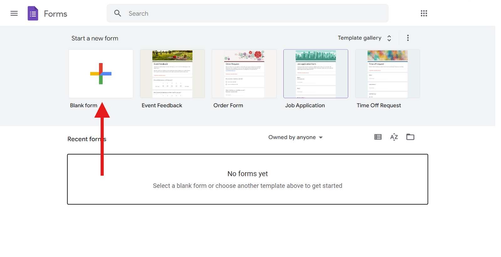 - Google Formlar ana sayfasına gidin ve yeni bir form oluşturmak için sayfanın üst kısmındaki Blank Form butonuna tıklayın ya da mevcut bir formu açın.