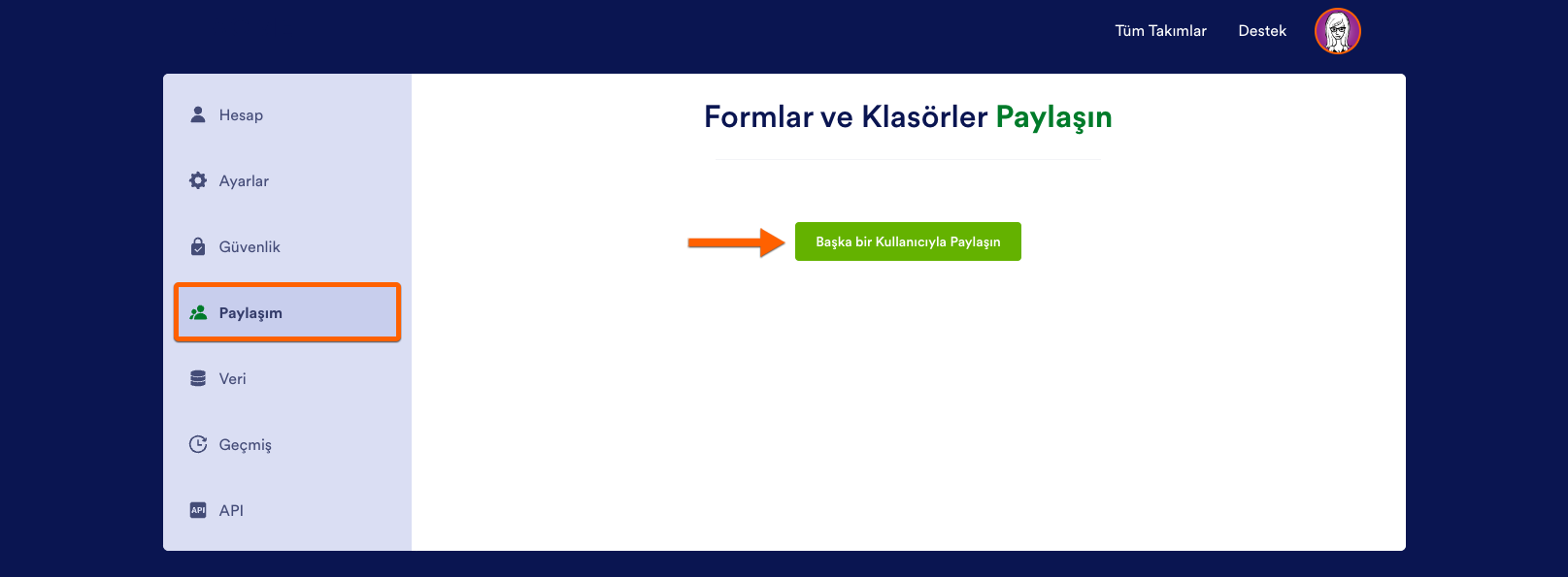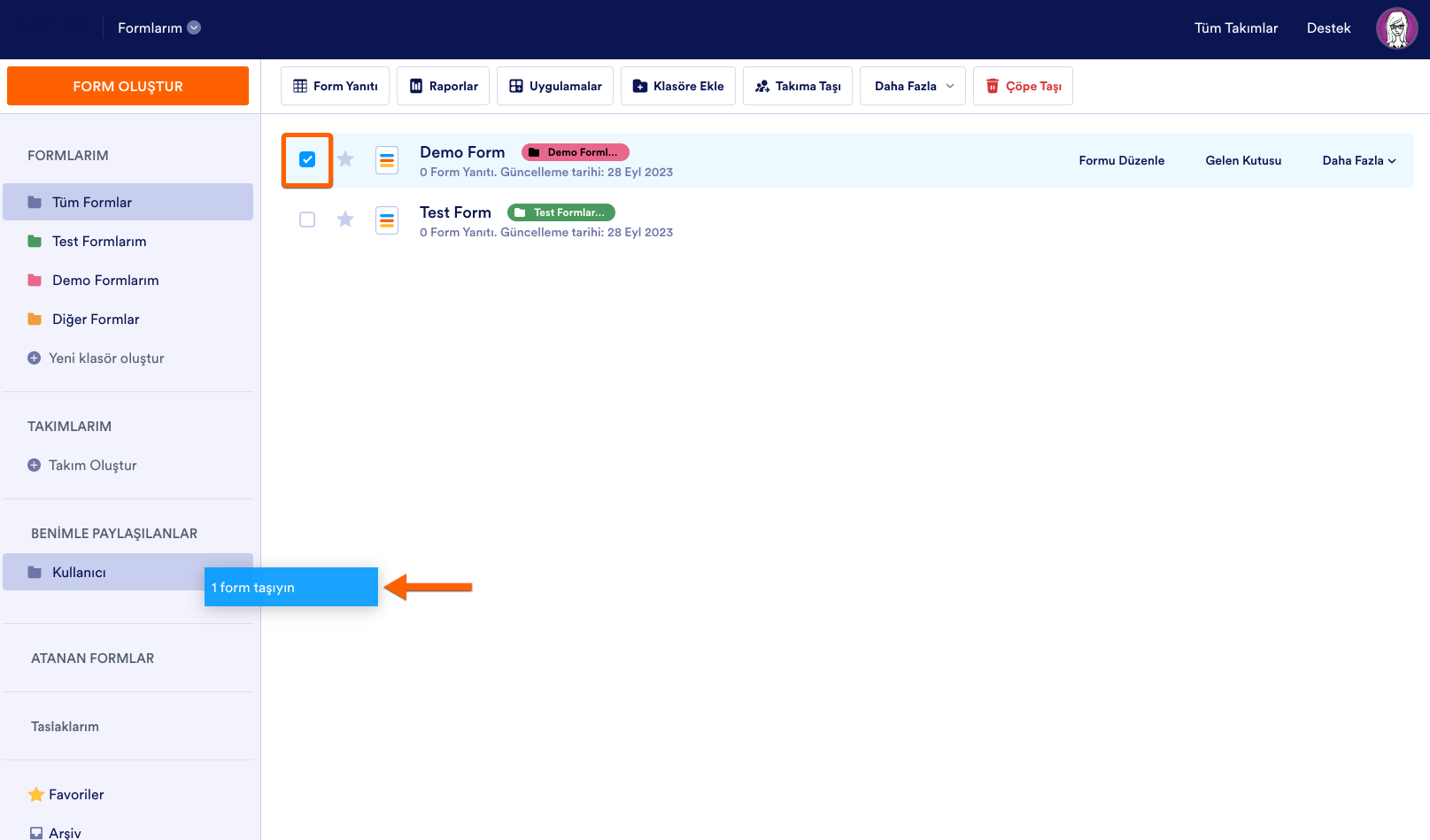 Erişim izni verdiğiniz kullanıcı, paylaşılan formlarınıza kendi kontrol panelinin Benimle Paylaşılanlar bölümünden erişebilir.