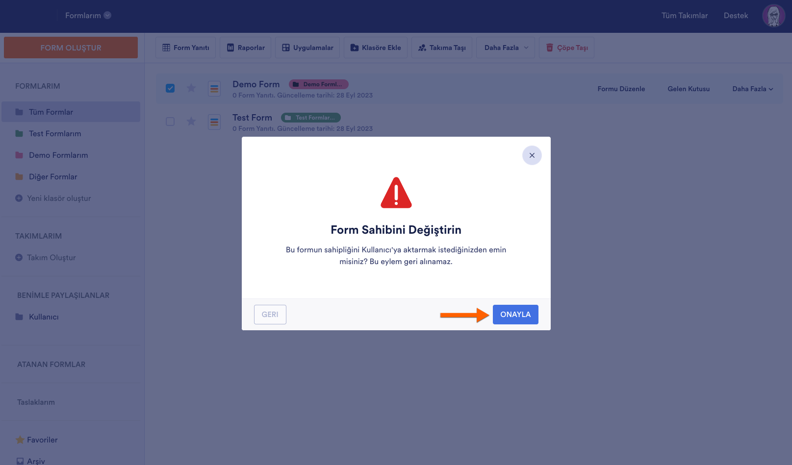 - Son olarak formun sahipliğini aktarmak için Onayla’ya tıklayın.