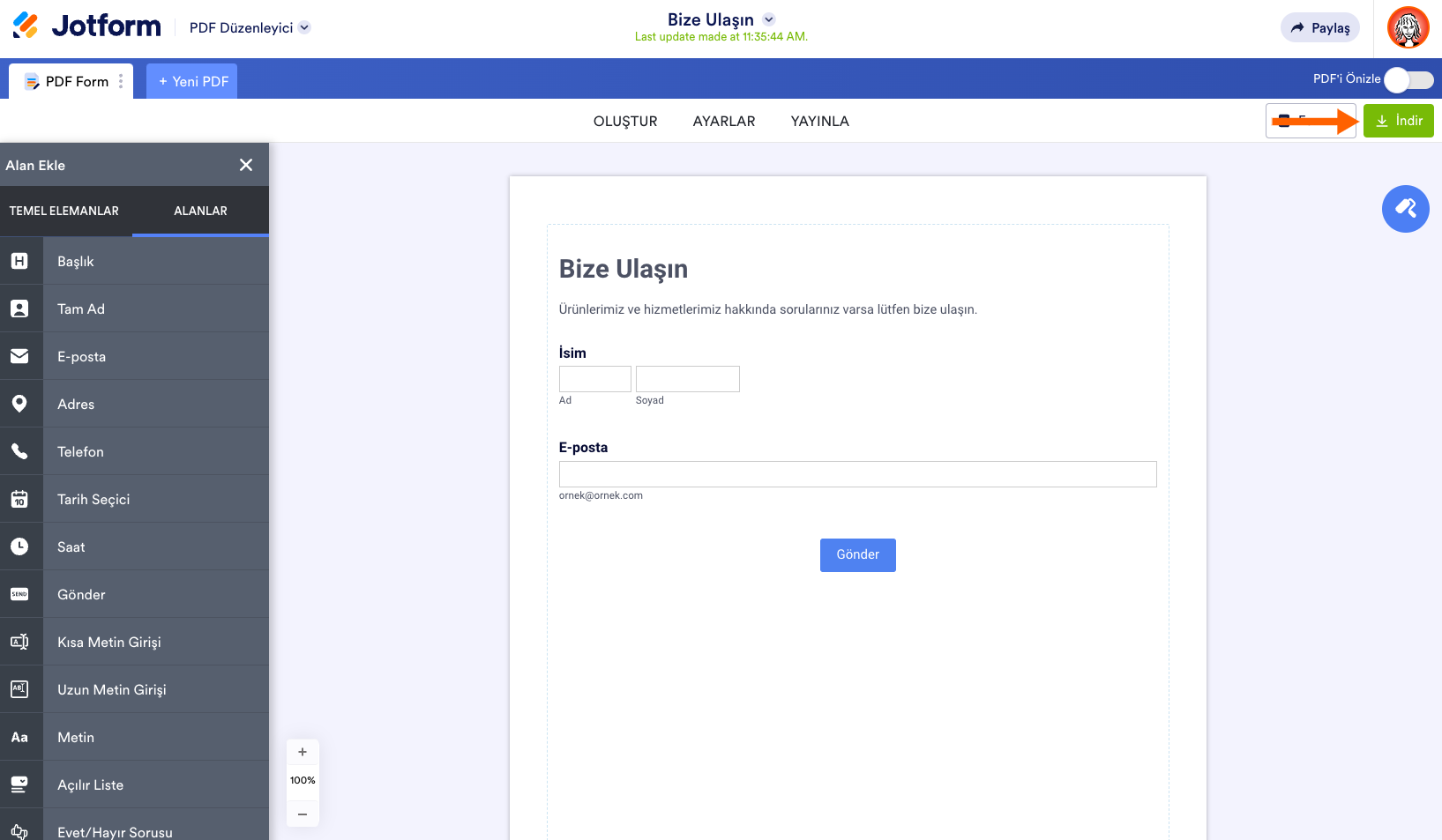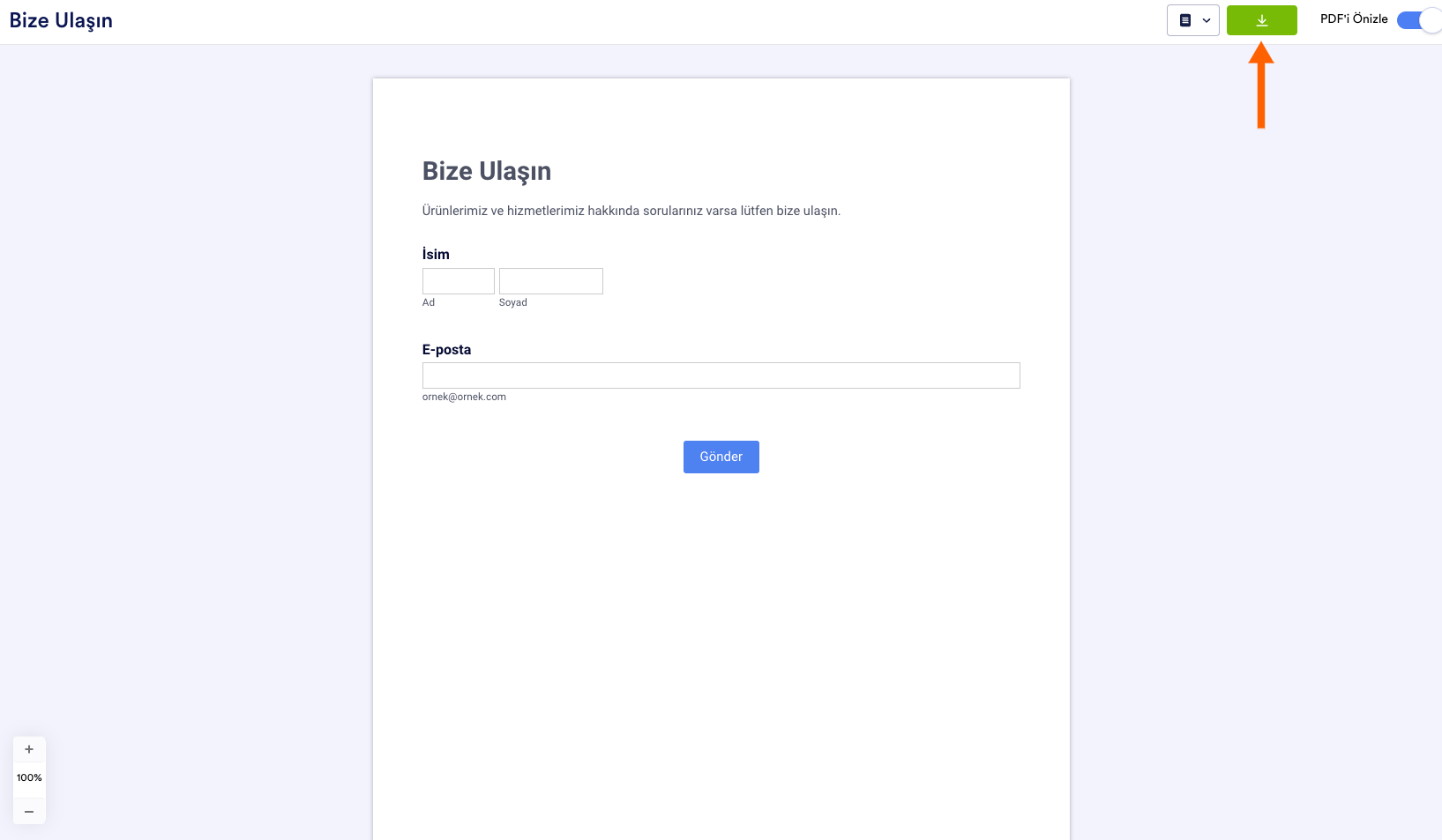 PDF formunu oluşturmayı tamamladığınızda sağ üst köşedeki İndir düğmesine tıklayarak PDF formunu hızlı bir şekilde indirebilirsiniz.