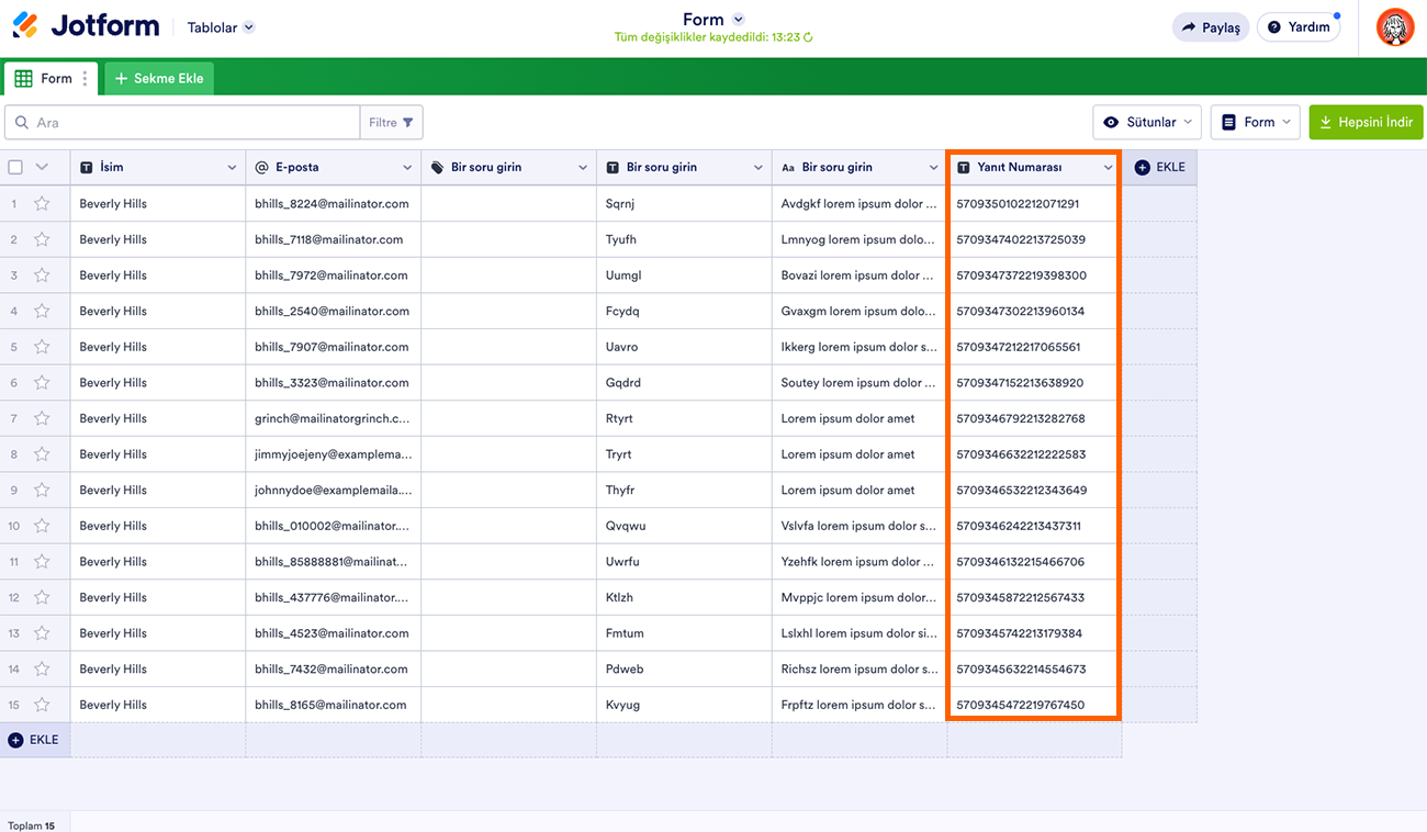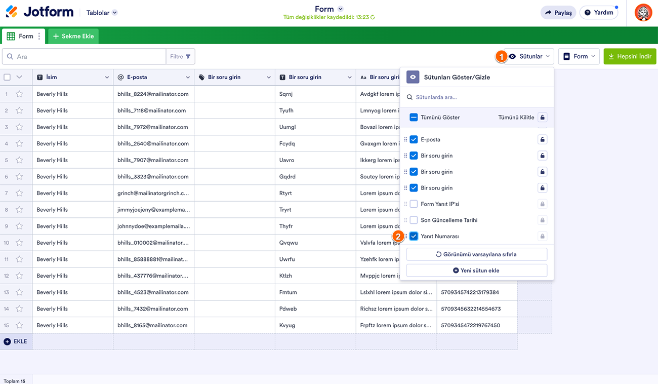 - Sütunları Göster/Gizle kutusunu kapatın. Yanıt Numaraları Jotform Tablolar’da ayrı bir sütunda gösterilecektir: