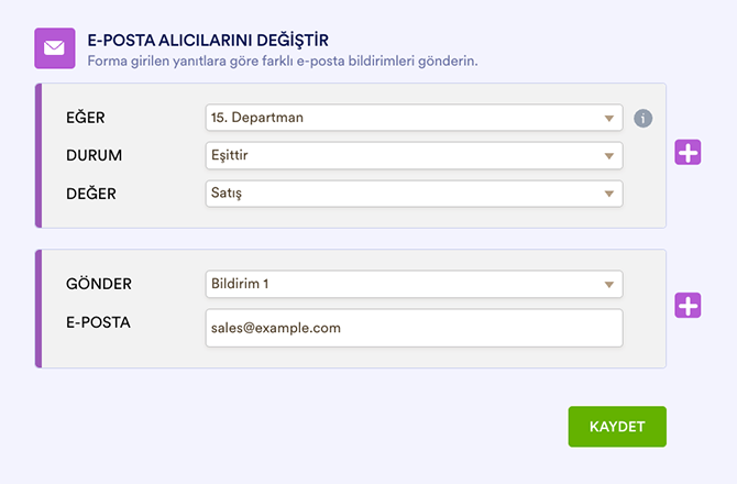 - Kullanıcı yanıtlarına göre farklı adreslere e-posta göndermek,