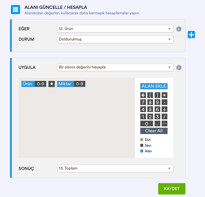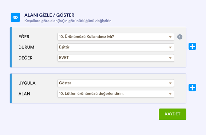 Koşullu Mantık seçeneğini belirledikten sonraki ekran dinamik bir formdur. Eklediğiniz alanlar ve belirlediğiniz seçenekler eğer-o zaman ifadesini belirler.