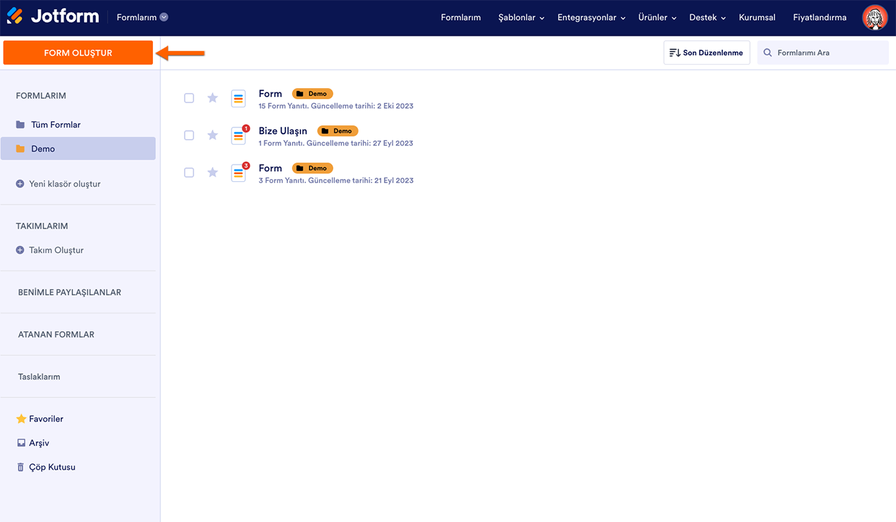 - Formlarım sayfanıza gidin ve sol üst taraftaki Form Oluştur’a tıklayın.