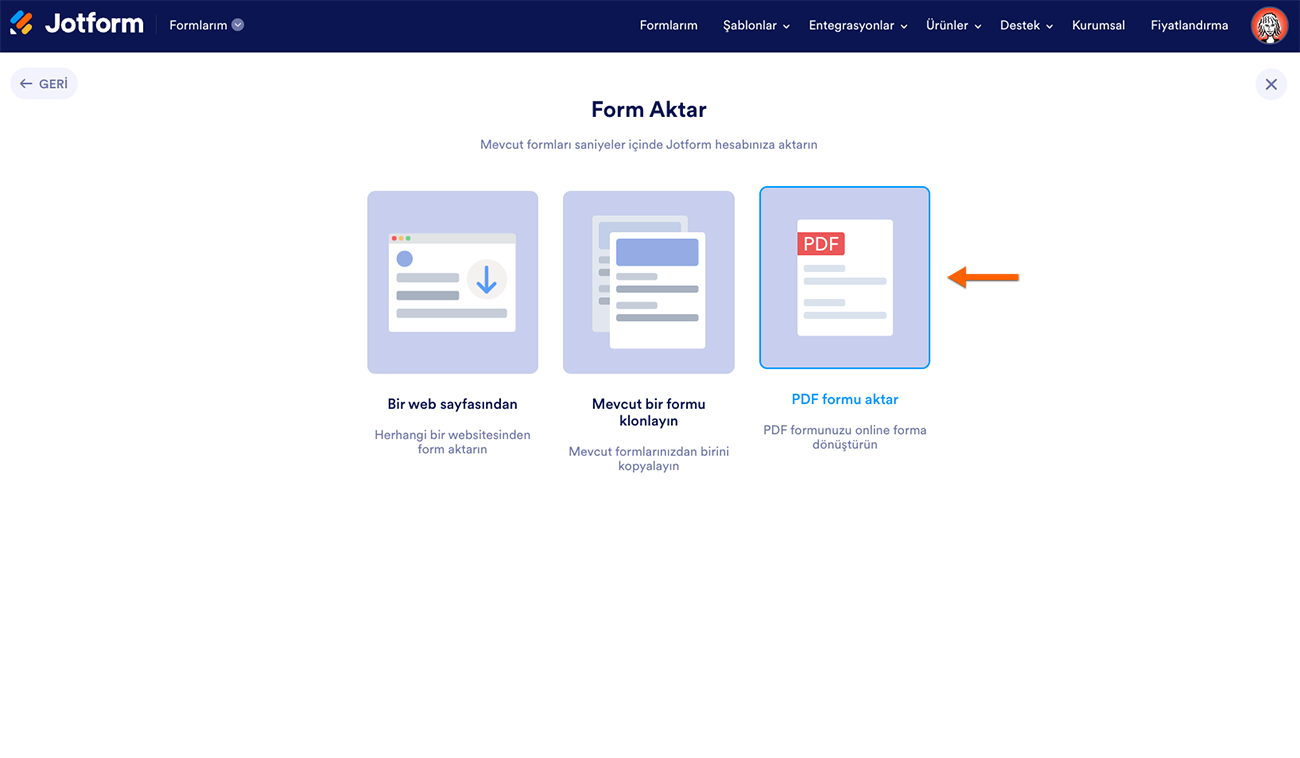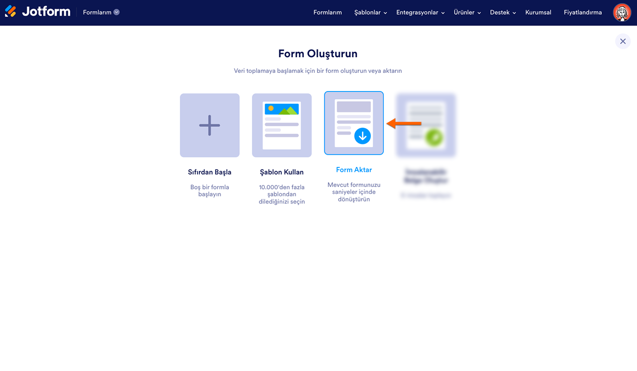 - Form Oluşturun’un altındaki Form Aktar’a tıklayın.