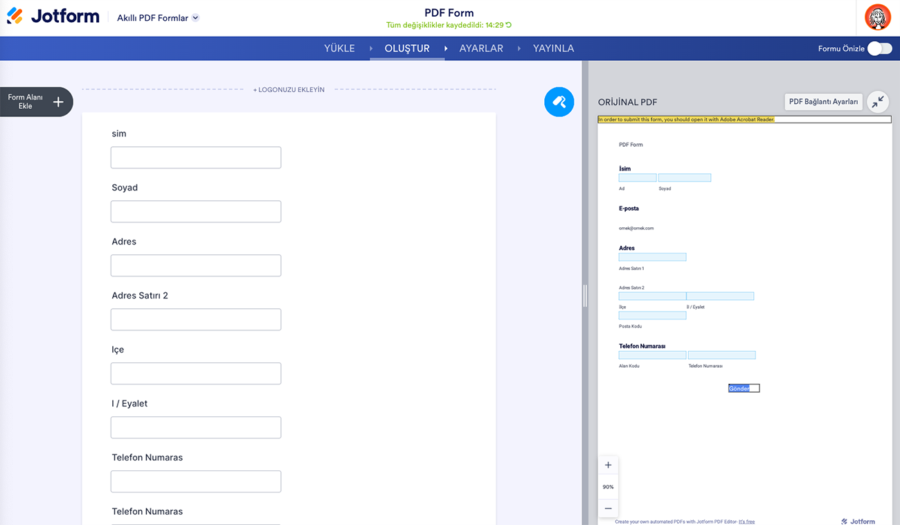 Bu işlem tamamlandıktan sonra, aktarılan PDF’nizi ve ondan oluşturulan online formu birlikte görmelisiniz. Online formun aktarılan dosyayla aynı görünmeyeceğini unutmayın. Sistem, form alanlarını PDF dosyanızdan alıp kopyalamak için elinden geleni yapacaktır.