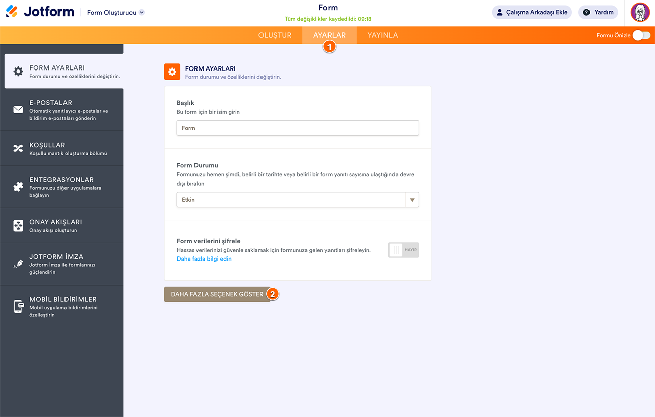 - Form Oluşturucu’da üstteki menüden Ayarlar’a tıklayın.