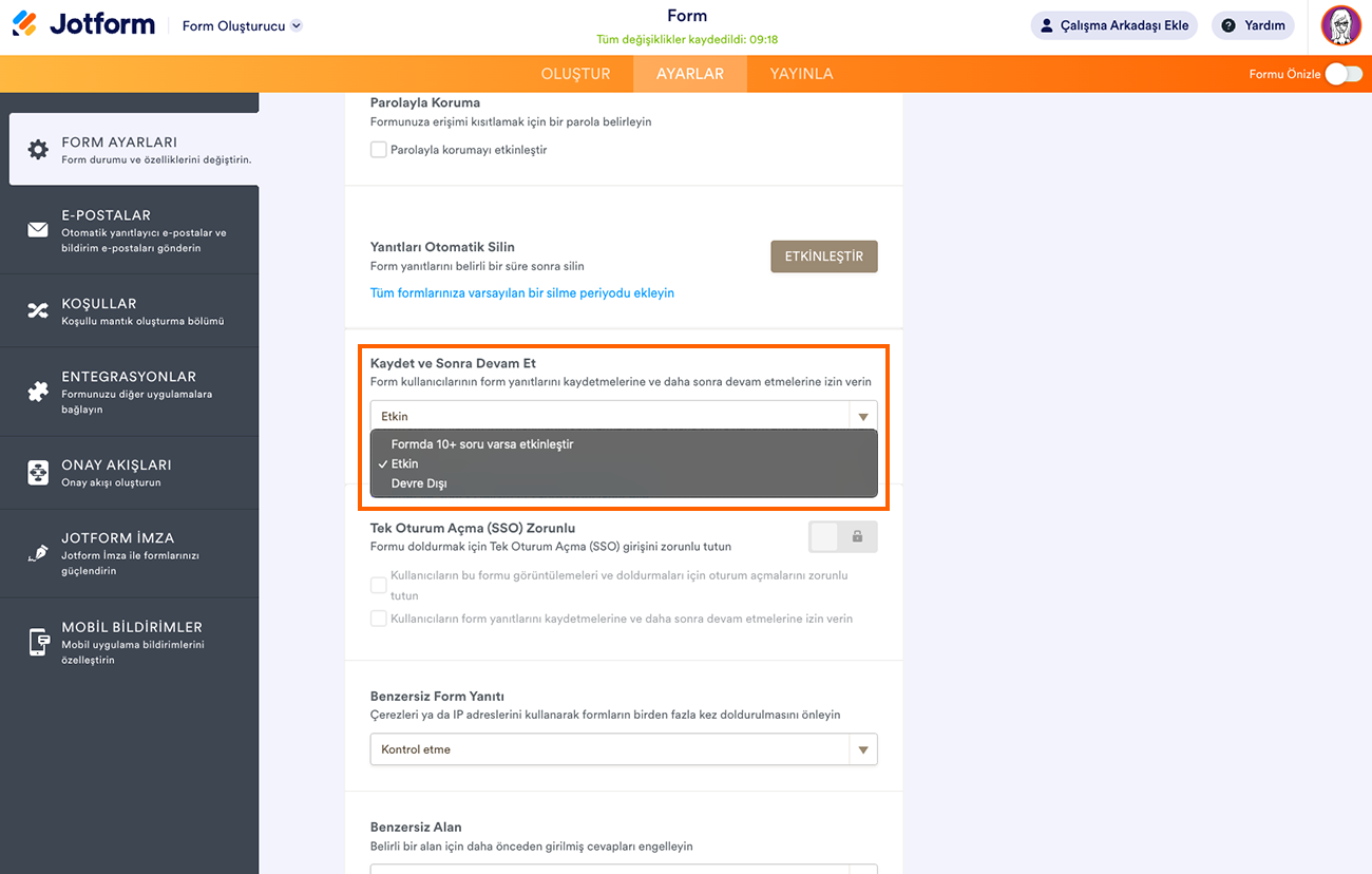 Jotform’da oluşturduğunuz kart formunuzda Forma Sonra Devam Etme özelliğini etkinleştirerek kullanıcılarınızın yanıtlarını kaydedip formu doldurmaya istedikleri zaman devam etmelerini sağlayabilirsiniz.