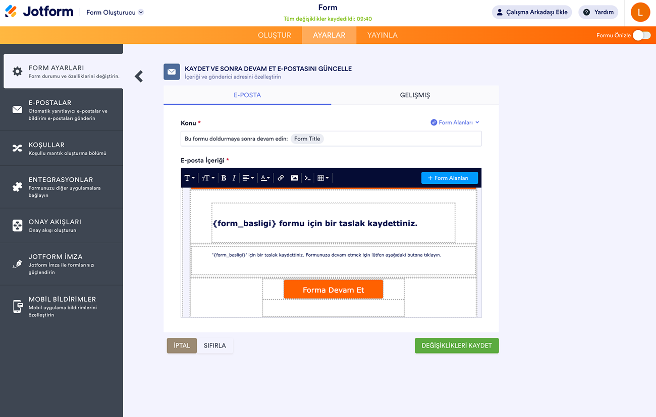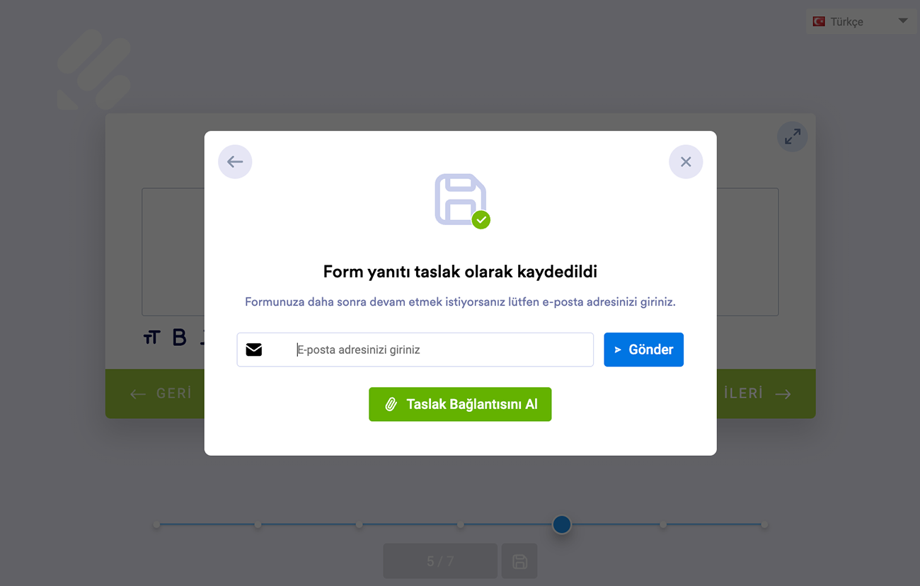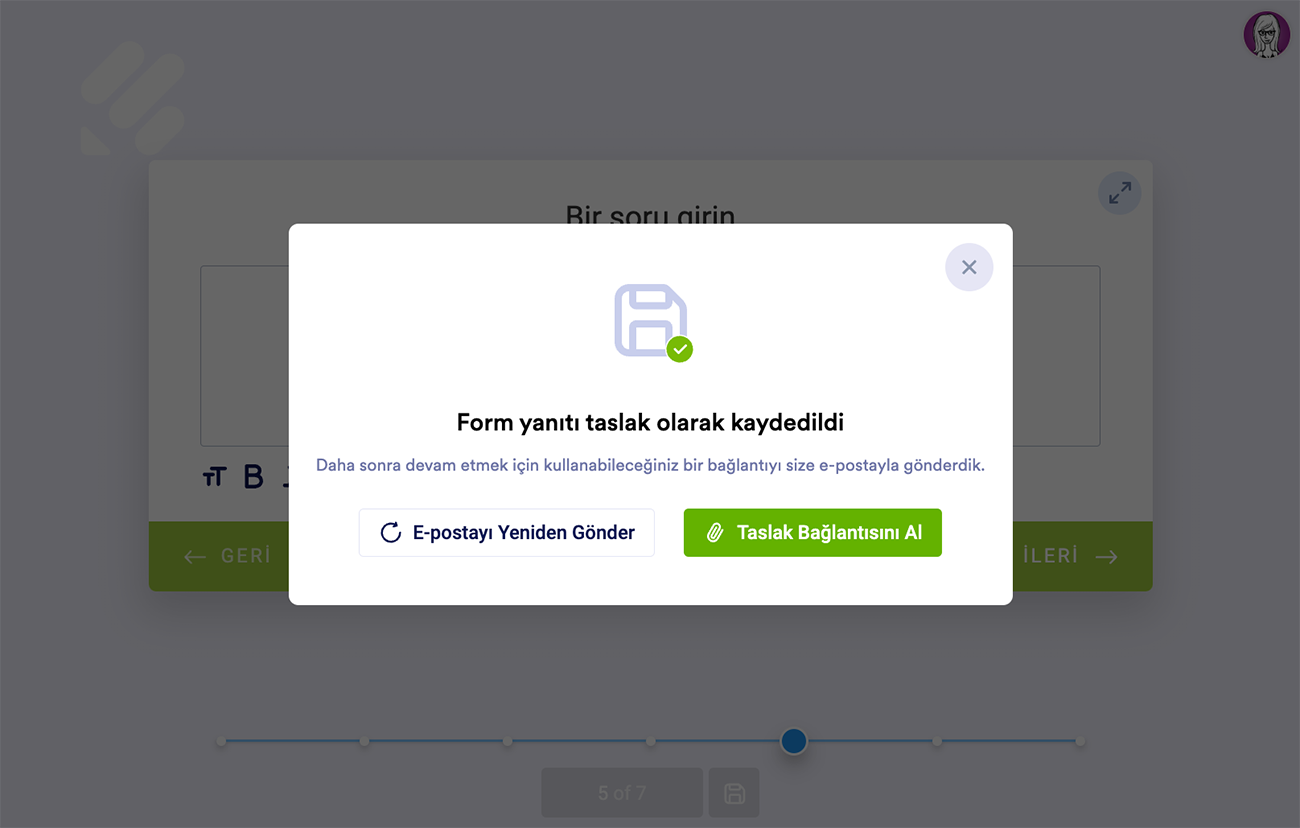 Jotform hesabına giriş yapan kullanıcılar Kaydet & Sonra Devam Et’i seçtiğinde oturum bağlantısı otomatik olarak kayıtlı e-posta adreslerine gönderilir. Ekranda ise e-postayı yeniden göndermeyi veya taslağa tekrar ulaşmak için bir bağlantı almayı seçebilecekleri bir onay mesajı görüntülenecektir.