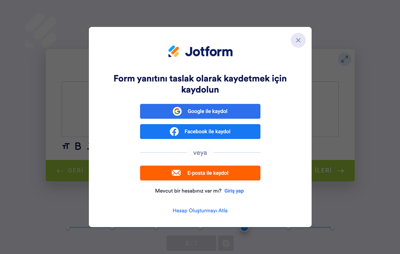 Oturumlarını kapatmış kullanıcılar veya Jotform hesabı olmayanlar Kaydet & Daha Sonra Devam Et’i seçtiklerinde oturum bağlantısını kaydedebilecekleri veya Jotform’a giriş yapabilecekleri bir iletişim kutusu görüntülenir. Oturum URL’sini almak için alttaki Hesap Oluşturmayı Atla’yı da seçebilirler.