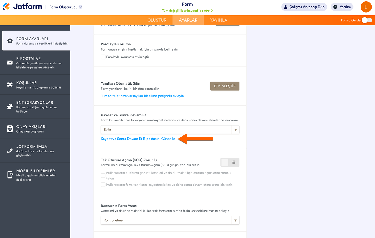 Formunuzu dolduranlara gönderilen oturum bağlantısını içeren e-postayı özelleştirmek için Kaydet ve Sonra Devam Et bölümündeki Kaydet ve Daha Sonra Devam Et E-postasını Güncelle bağlantısını seçin.