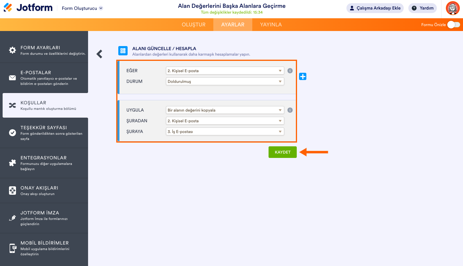 - Form Oluşturucu‘da Ayarlar sekmesine gidin.