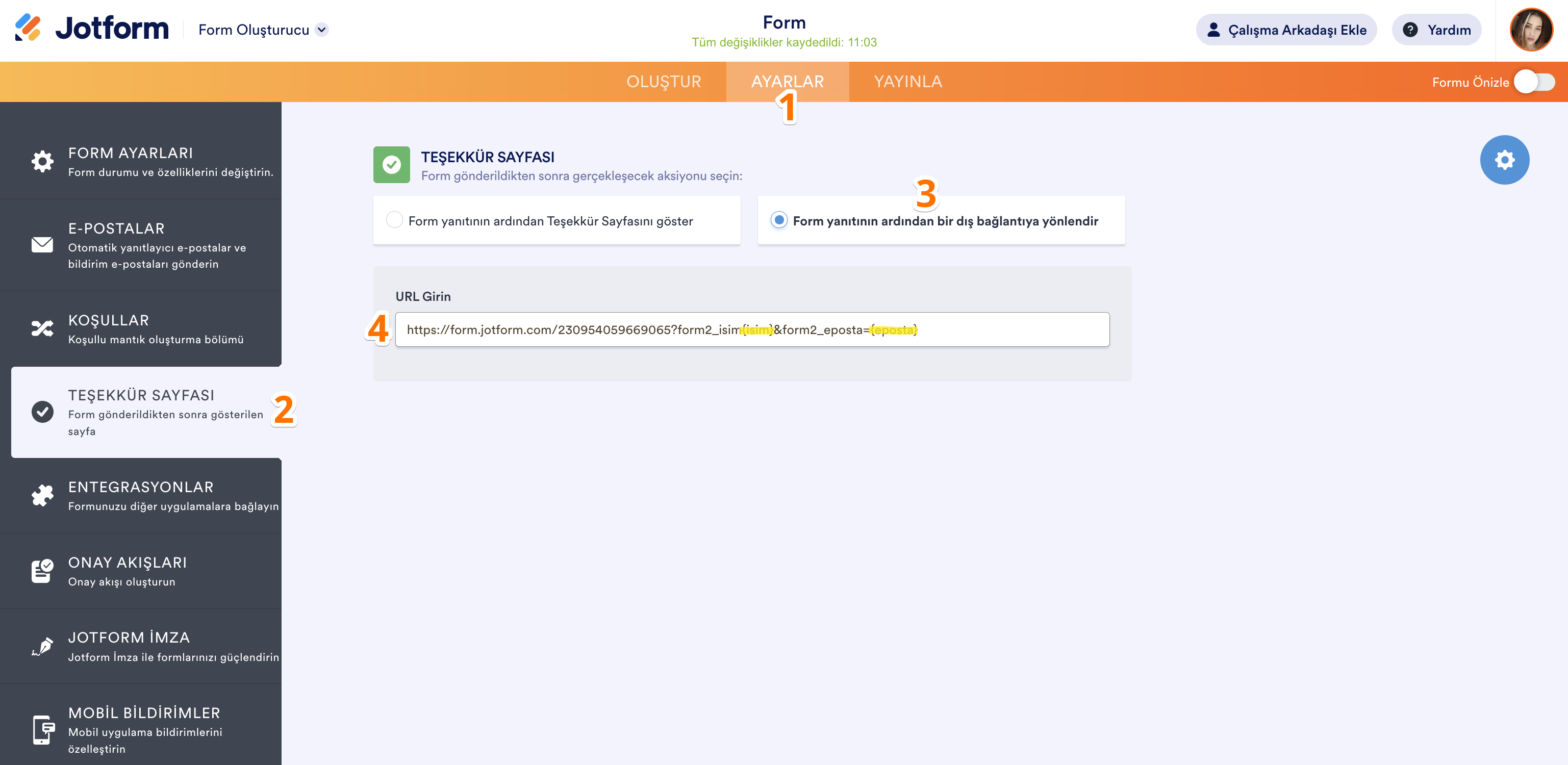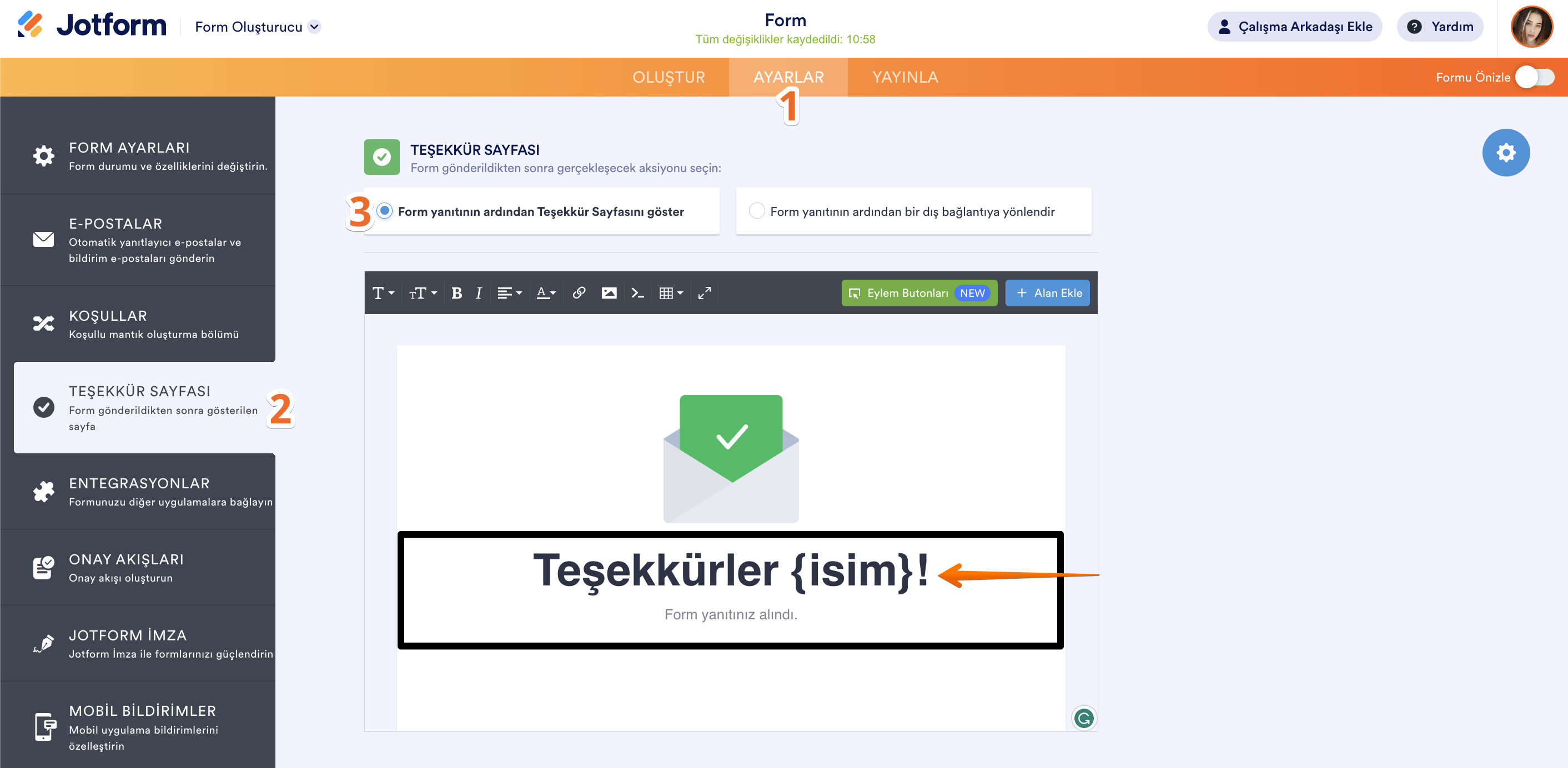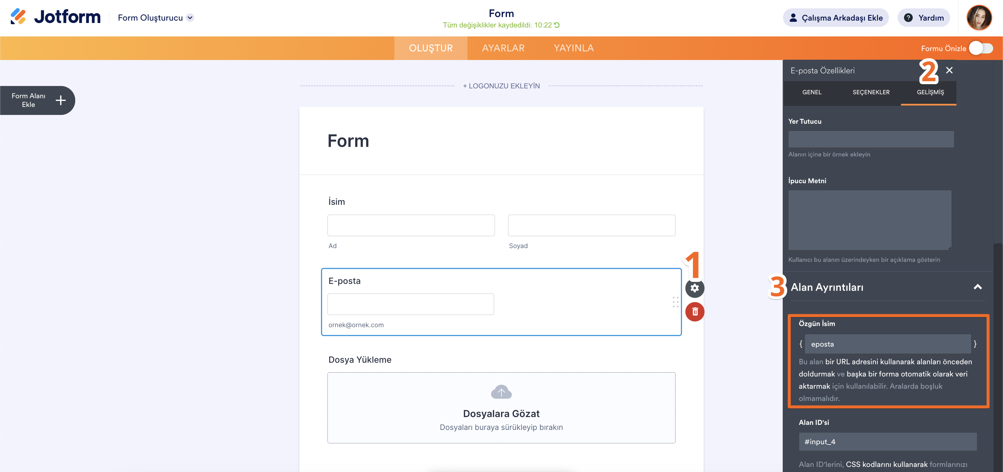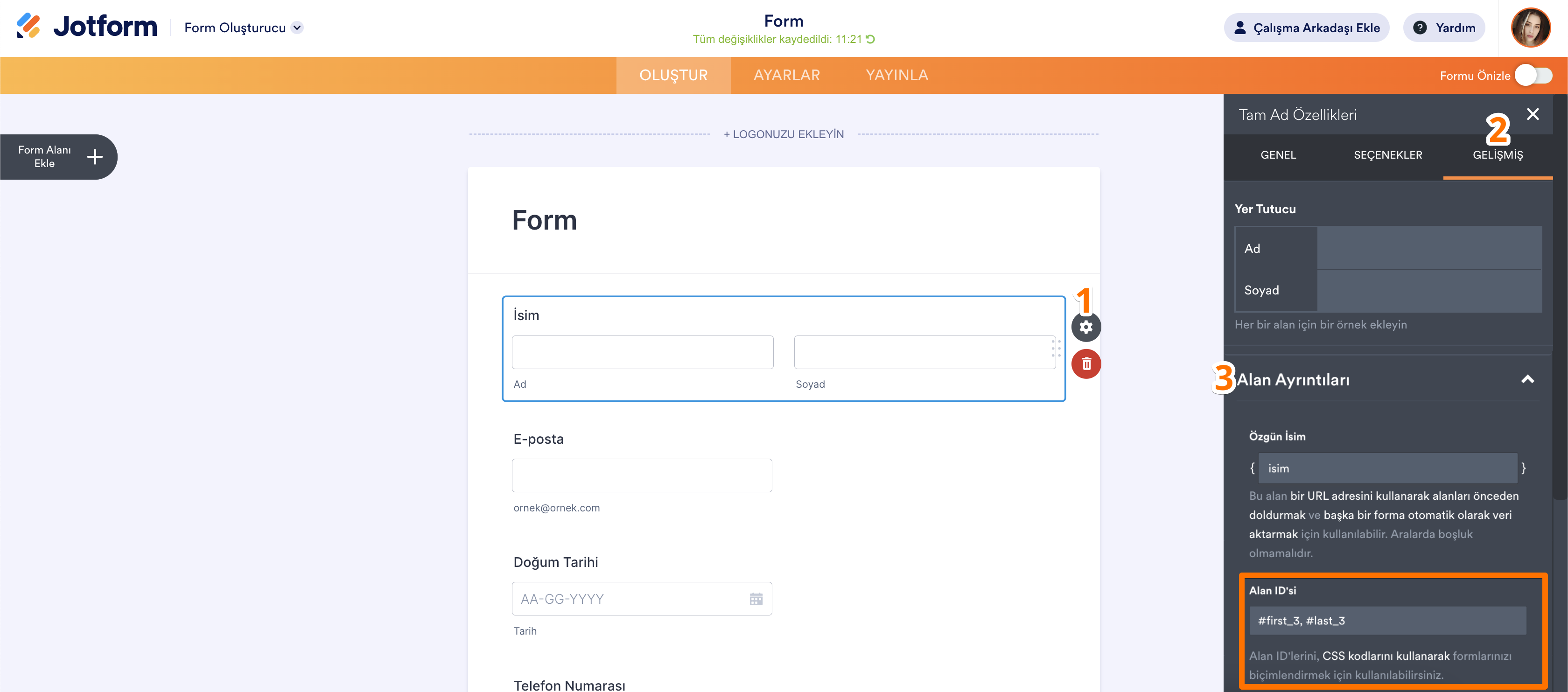 Alanın özgün ismini e-posta uyarılarında, Teşekkür sayfasında veya diğer alanlarda olduğu gibi başka yerlerde de yer vermek için kullanabilirsiniz. Form alanlarını önceden doldurmak için yine özgün isimleri kullanabilirsiniz.