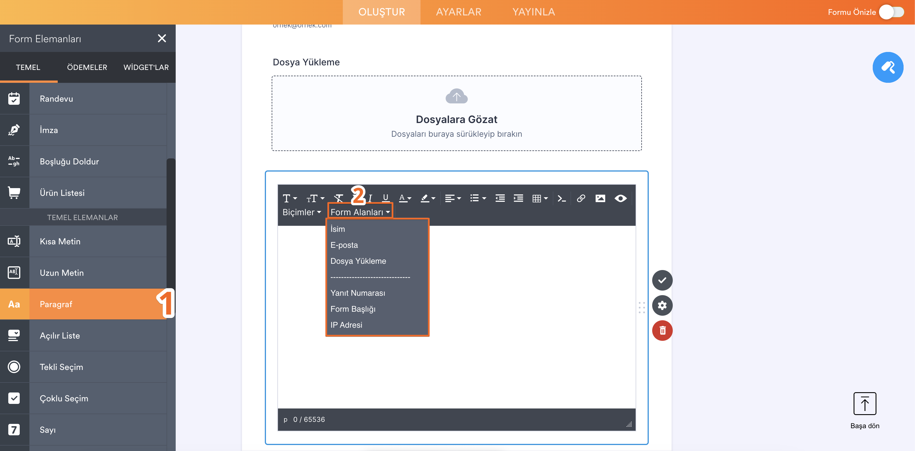 - Form Oluşturucu’da eklediğiniz form elemanını seçin ve Özellikler bölümünü görüntülemek için çark simgesine tıklayın.