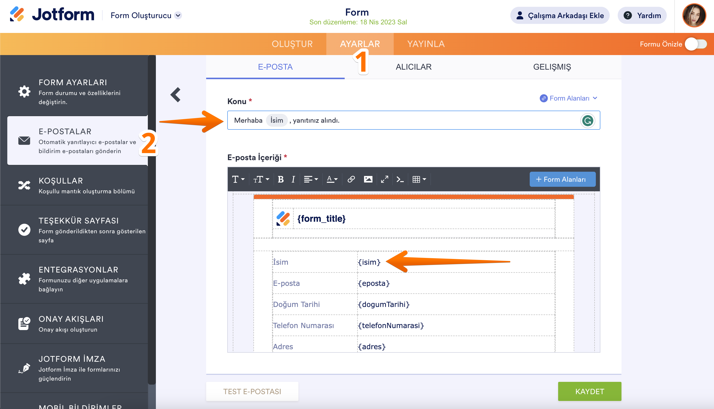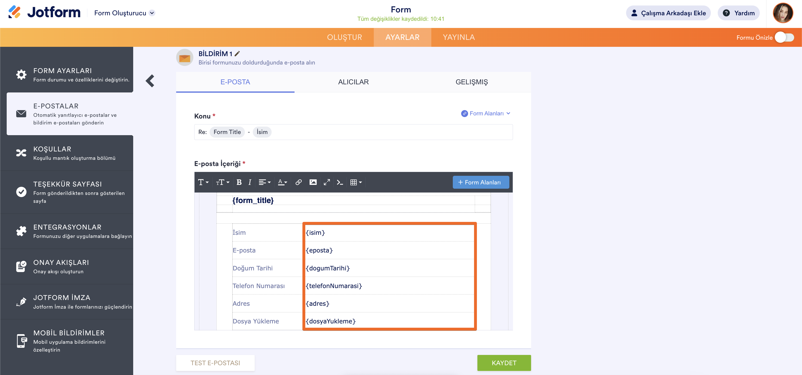 Alanların özgün isimleri formunuzun varsayılan e-posta uyarılarında da bulunabilir.