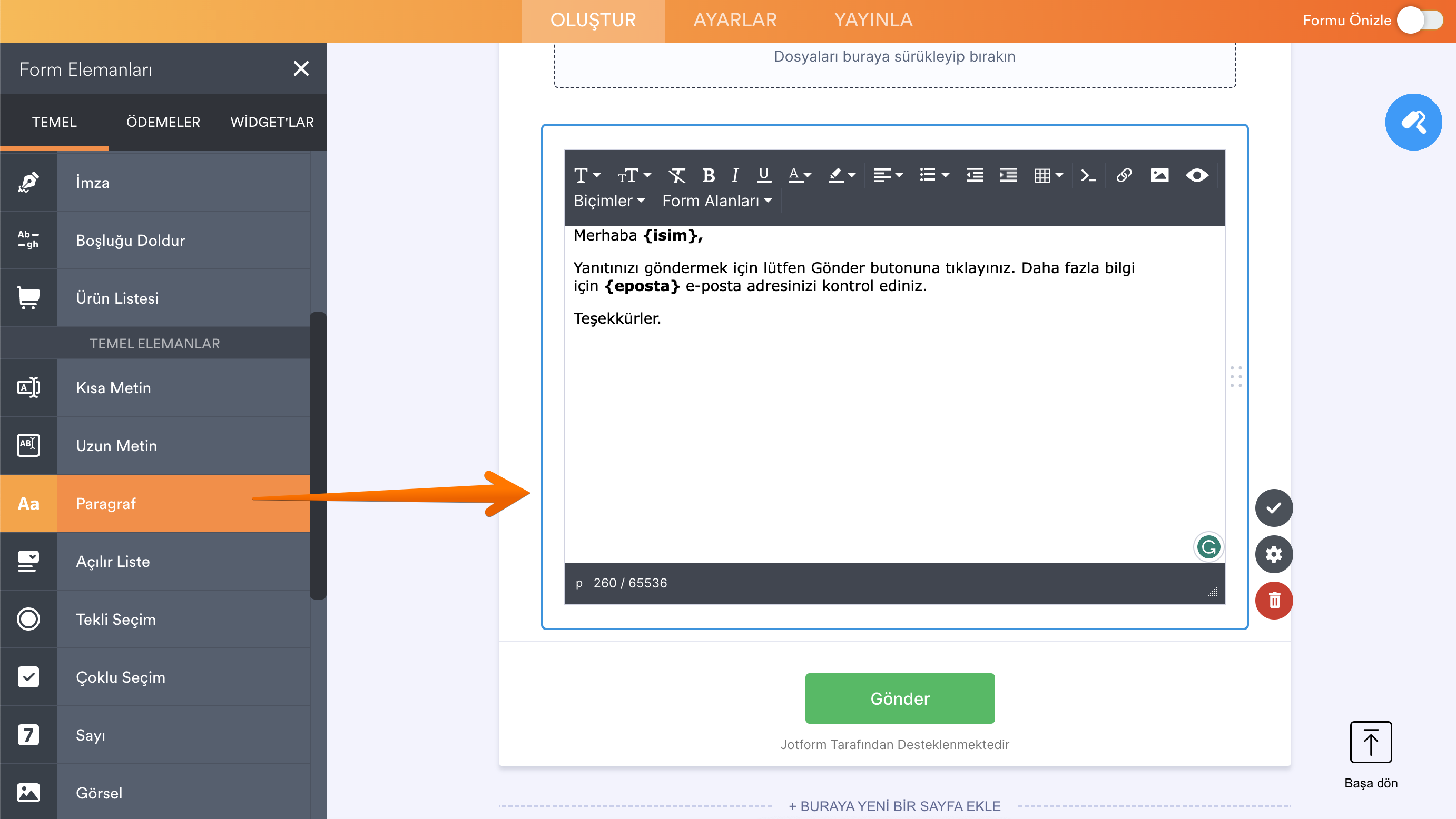 Alanların özgün isimlerini Paragraf öğelerinde ve e-posta uyarılarında veya Teşekkür sayfasında kullanabilirsiniz.