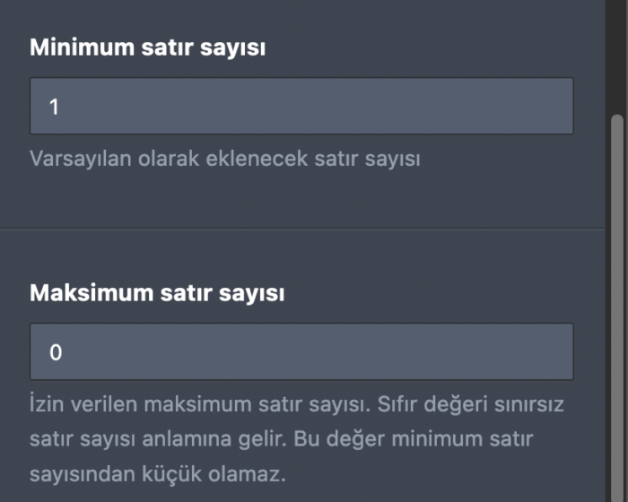Formuzuna eklenebilecek maksimum satır limitini belirlemek için, Maksimum satır sayısı alanına istediğiniz değeri girebilirsiniz.