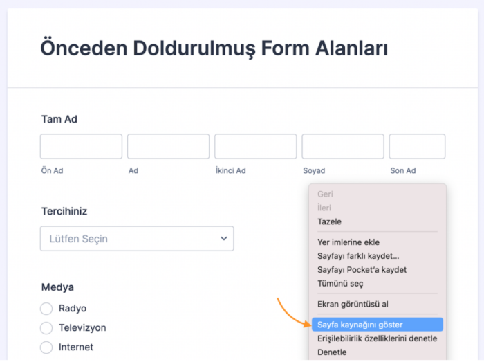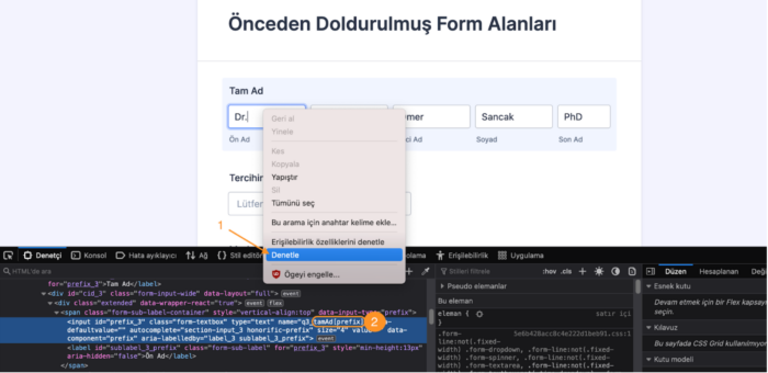 Alternatif olarak, tarayıcınızın Denetle özelliğini kullanarak da form alanlarının benzersiz isimlerini kolaylıkla bulabilirsiniz. Bunun için ilgili girdi/seçici alanına sağ tıklayıp Denetle’ye tıklamanız yeterlidir.