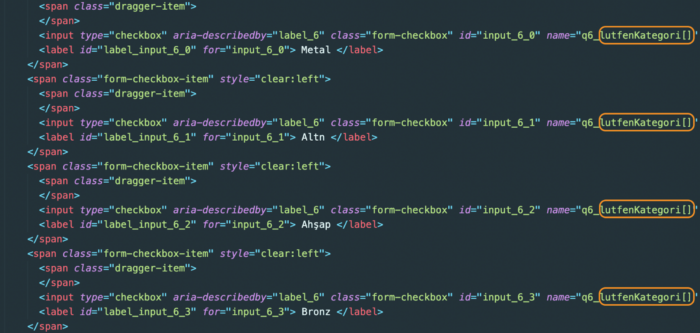 Öncelikle her bir Çoklu Seçim değerini tanımlayın. Örnek formumuzda, 4 tane seçenek bulunmaktadır. Tüm bu seçenekler aynı “lutfenKategori[]” adına sahiptir.