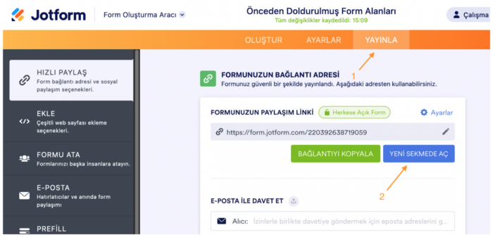 1. Yayınla sekmesine gidin ve formu yeni sekmede açın.