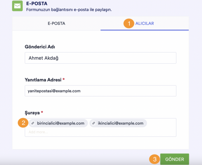 - Alıcılar sekmesine gidin ve “Şuraya” bölümüne e-postanın gönderileceği adres(ler)i girin. Birden çok alıcı eklemek için, e-posta adreslerini virgülle ayırabilirsiniz. Yine aynı bölümden, Gönderici Adı ve Yanıtlama Adresi’ni de değiştirebilirsiniz.