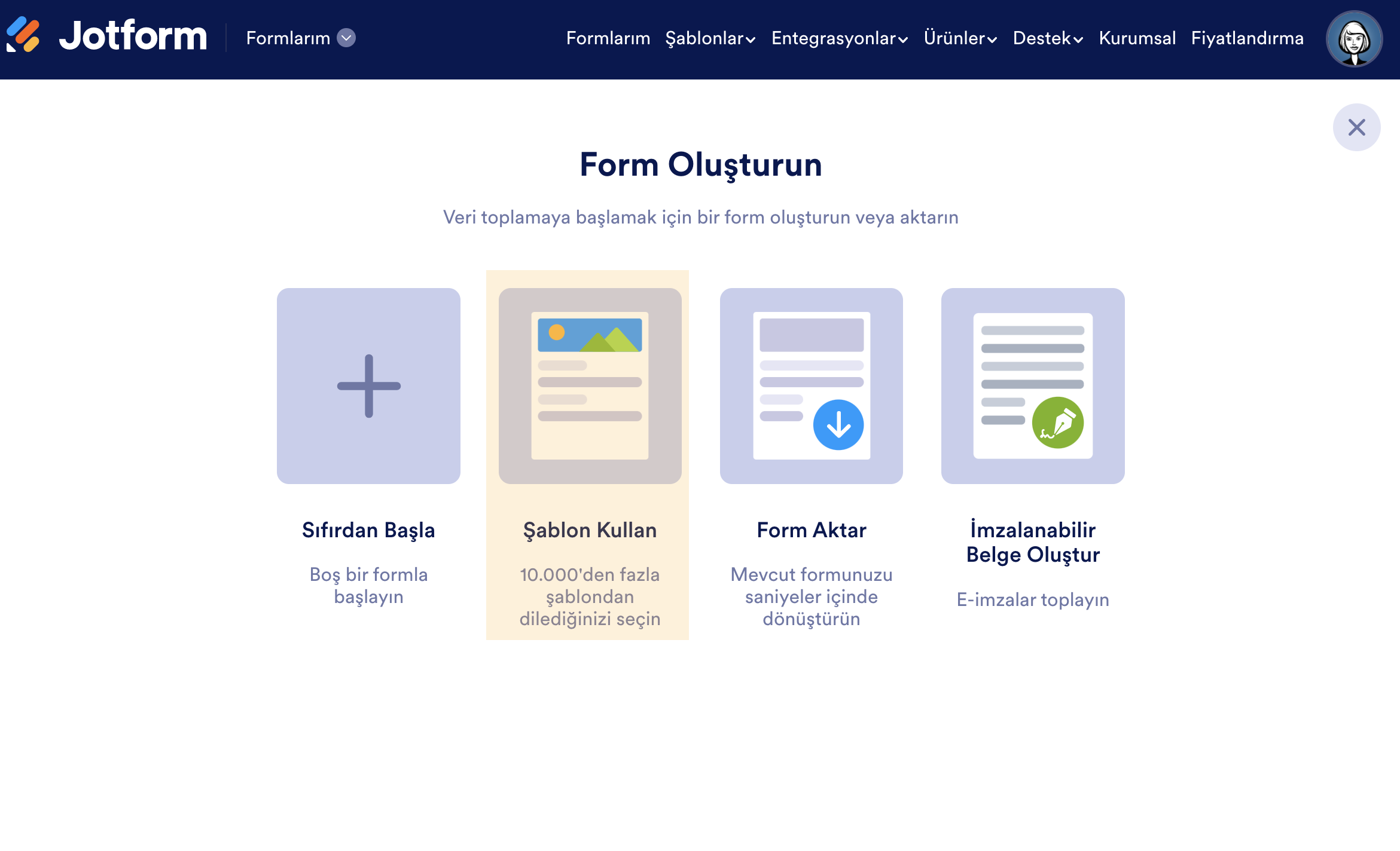 - Sayfanın ortasında yer alan Şablon Kullan ögesine tıklayın.