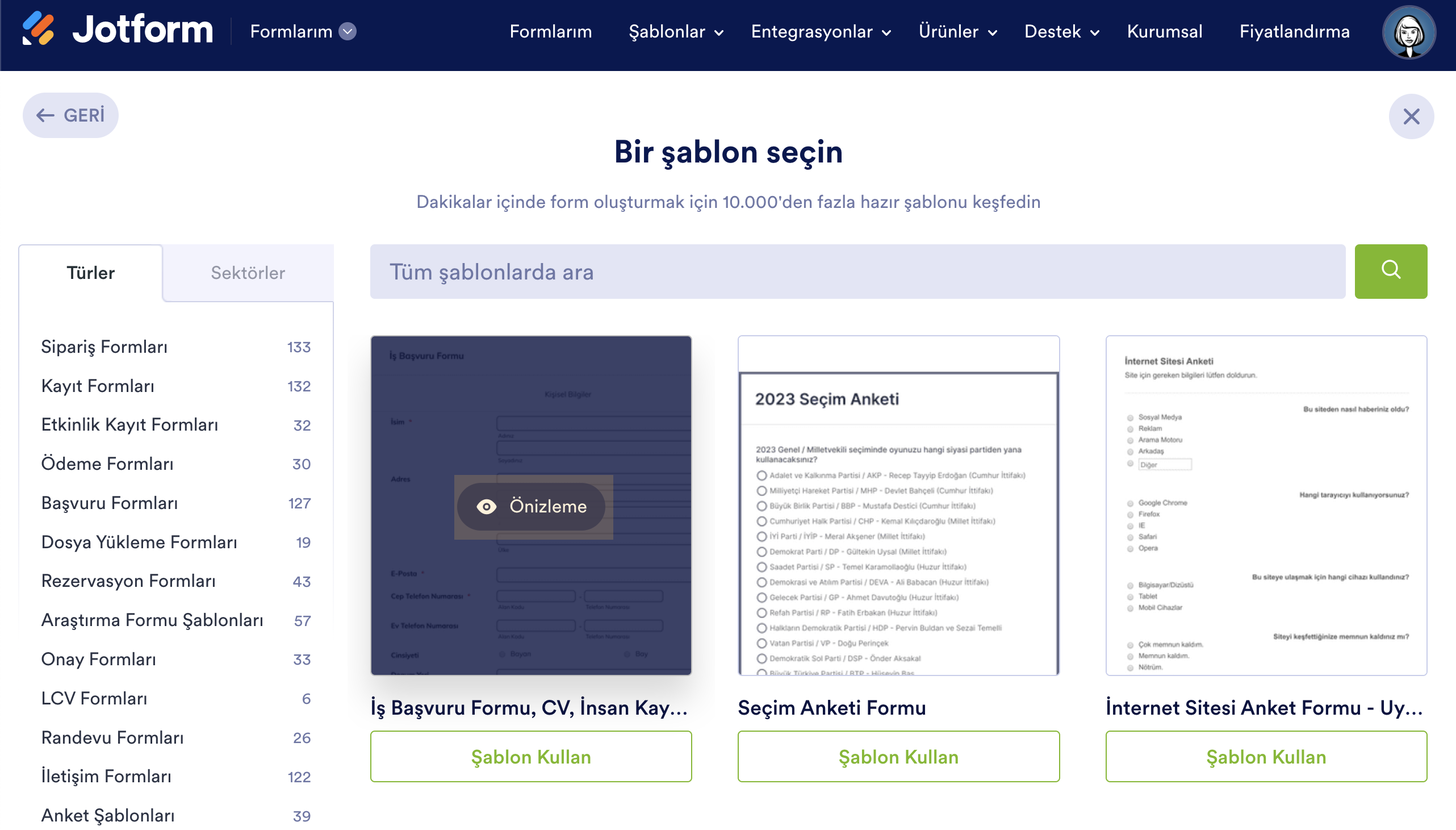 Eğer bir formu önizlemek istiyorsanız resmin üzerinde farenizi gezdirin ve üzerine tıklayın.