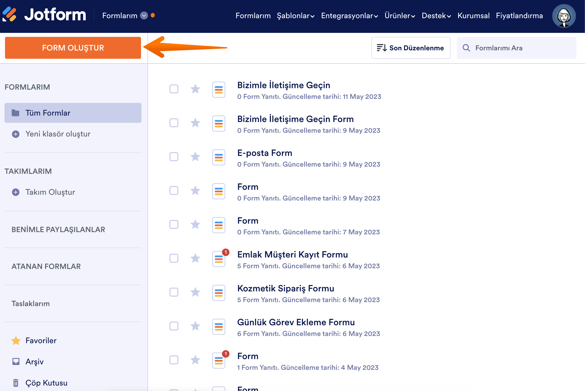 - Formlarım sayfasına gidin ve Form Oluştur butonuna tıklayın.
