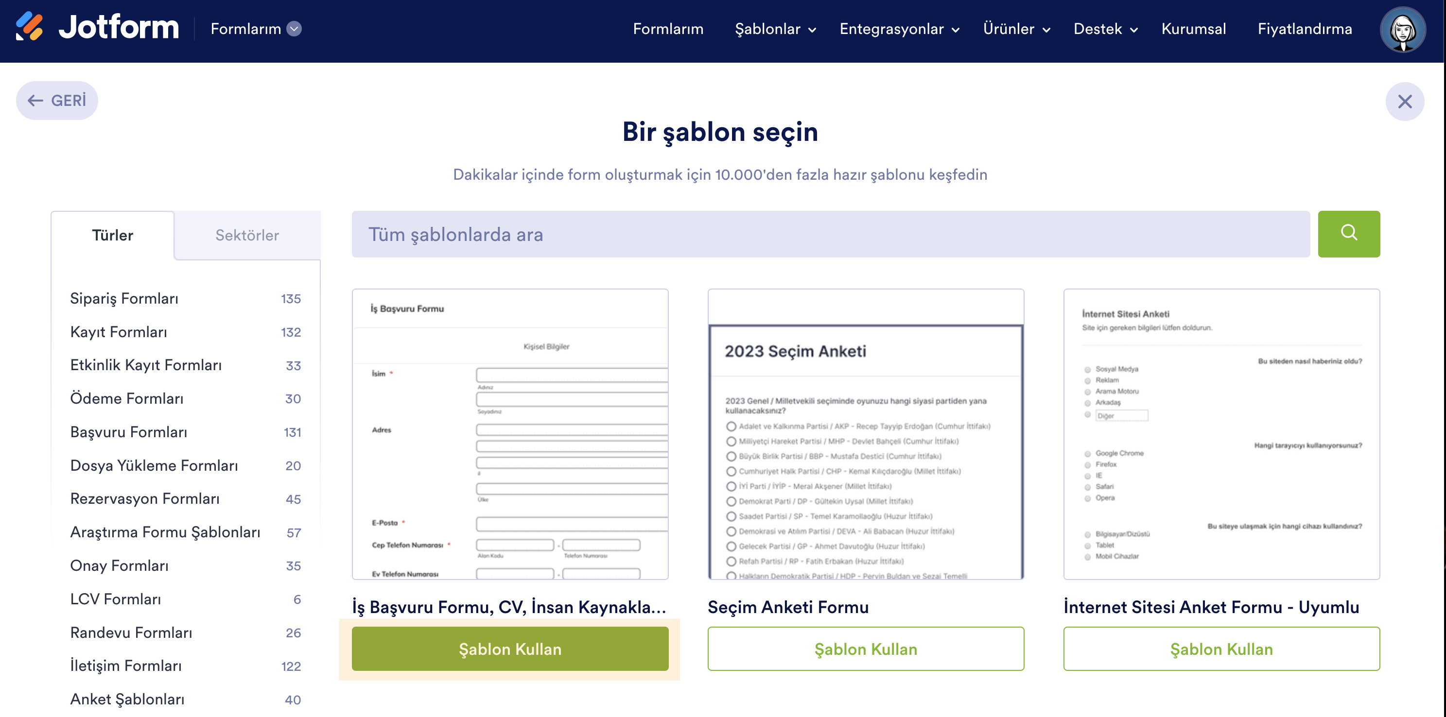 - İhtiyaçlarınıza en iyi uyan bir form şablonunu bulmak için arama çubuğunu kullanın. Formu bulduğunuzda Şablon Kullan butonuna tıklayın.