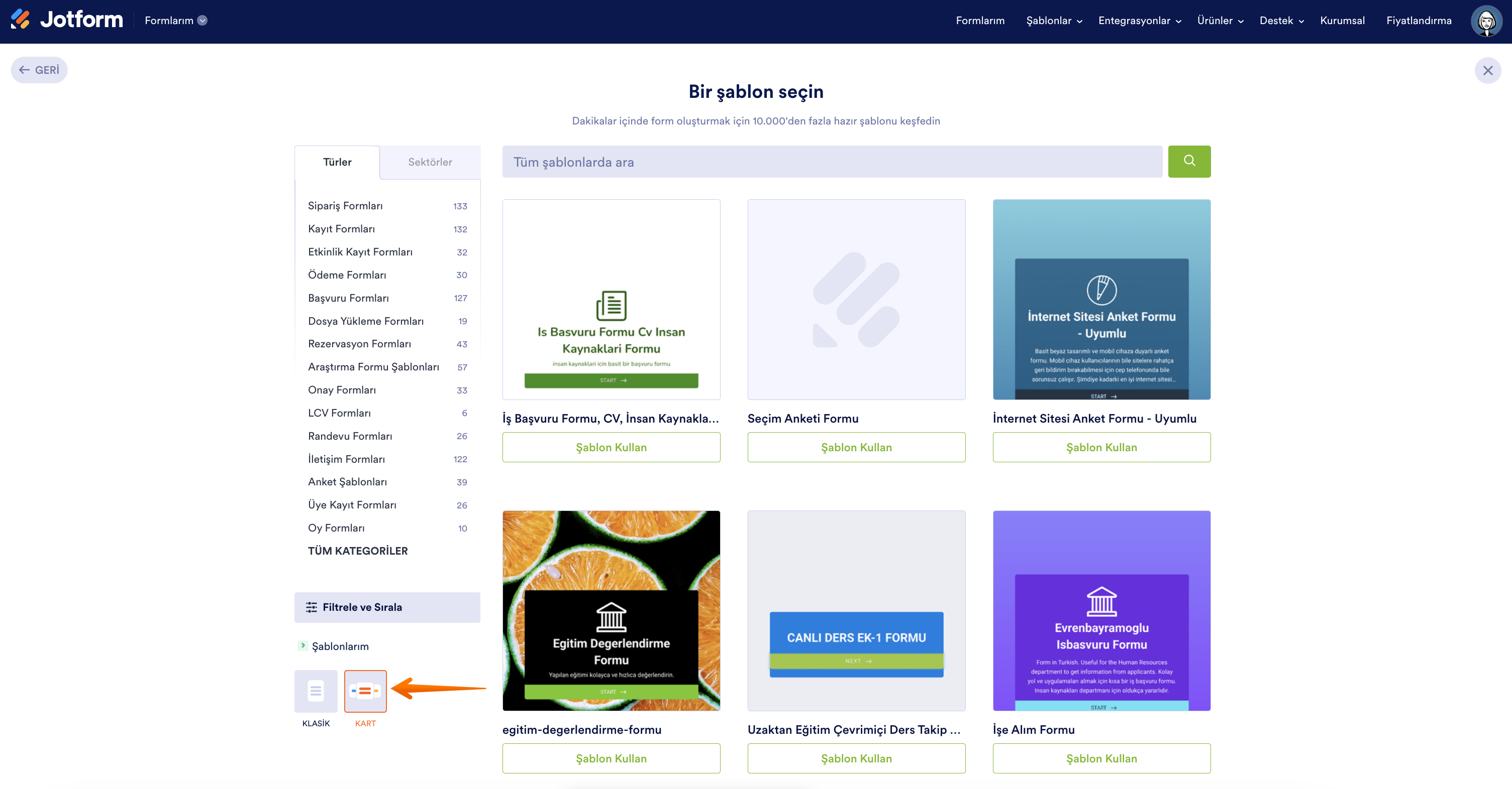 Şablon galerimizin varsayılan görünümü klasik düzen formları içindir. Eğer bir kart form şablonunu kullanmak istiyorsanız sayfayı ekranın solunda yer alan “Filtrele ve Sırala” seçeneğine kadar aşağı kaydırın ve Kart opsiyonunu seçin.